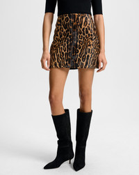 Product details Luxury, defined. The Ohemia mini skirt is expertly crafted from 100% Turkish baby calf leather with an ultra-soft hand feel. Tailored to perfection, it features a high-rise Hollywood waistband and back darting sculpts for a smooth, fitted look. The classic leopard print—warm tan punctuated by black and brown rosettes—makes it as much a neutral as it is a bold statement. It pairs well with everything from your favorite going-out top to a simple, crisp tee. - 100% Baby Calf - Lining: 100% Cupro - Fabric country of origin: Turkey - Professional leather cleaning only - Style #2509LT8630262
