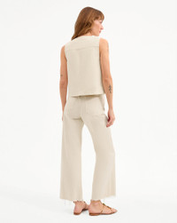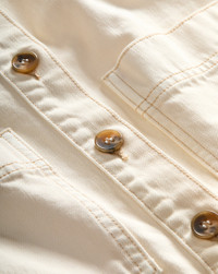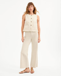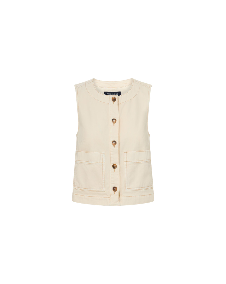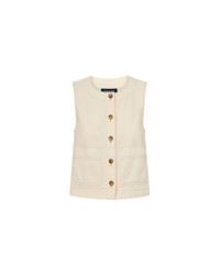 Product details An elevated take on the denim vest—in a chic, off-white wash for spring. Ording's streamlined, collarless design is cut for a relaxed fit with darting at the bust for a flattering shape. Two oversized front patch pockets, contrast stitching, and tortoiseshell buttons complete the look. Pair with matching ecru jeans for a double-denim moment, or style with an airy linen skirt for laid-back polish. - Details: 100% Cotton - Turn inside out and machine wash cold. Hang to dry. - Style #J2504D140001EC