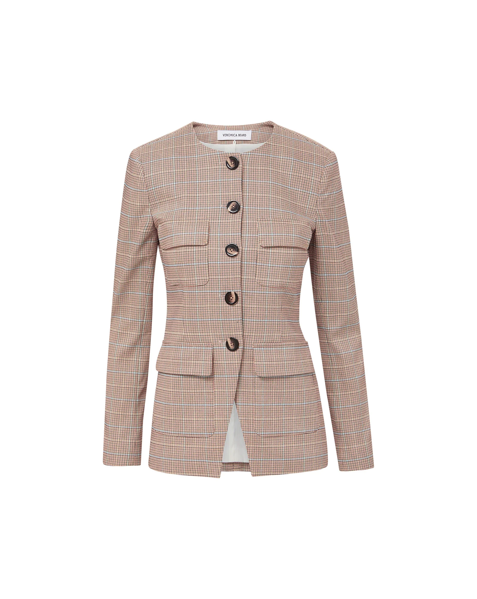 Product details Sleek and polished, Orrin is a slim-fitting, elongated jacket with a utilitarian edge. Crafted from a stretch-viscose blend in a versatile beige plaid, it features a collarless crew neckline, front flap pockets, and an angled cutaway hem for a lengthening effect. Layer it over your favorite VB denim to elevate the everyday. - 78% Viscose, 19% Polyester, 3% Elastane - Lining: 95% Polyester, 5% Elastane - Made in the USA - Fabric country of origin: Italy - Dry clean only - Style #2507PL8511149