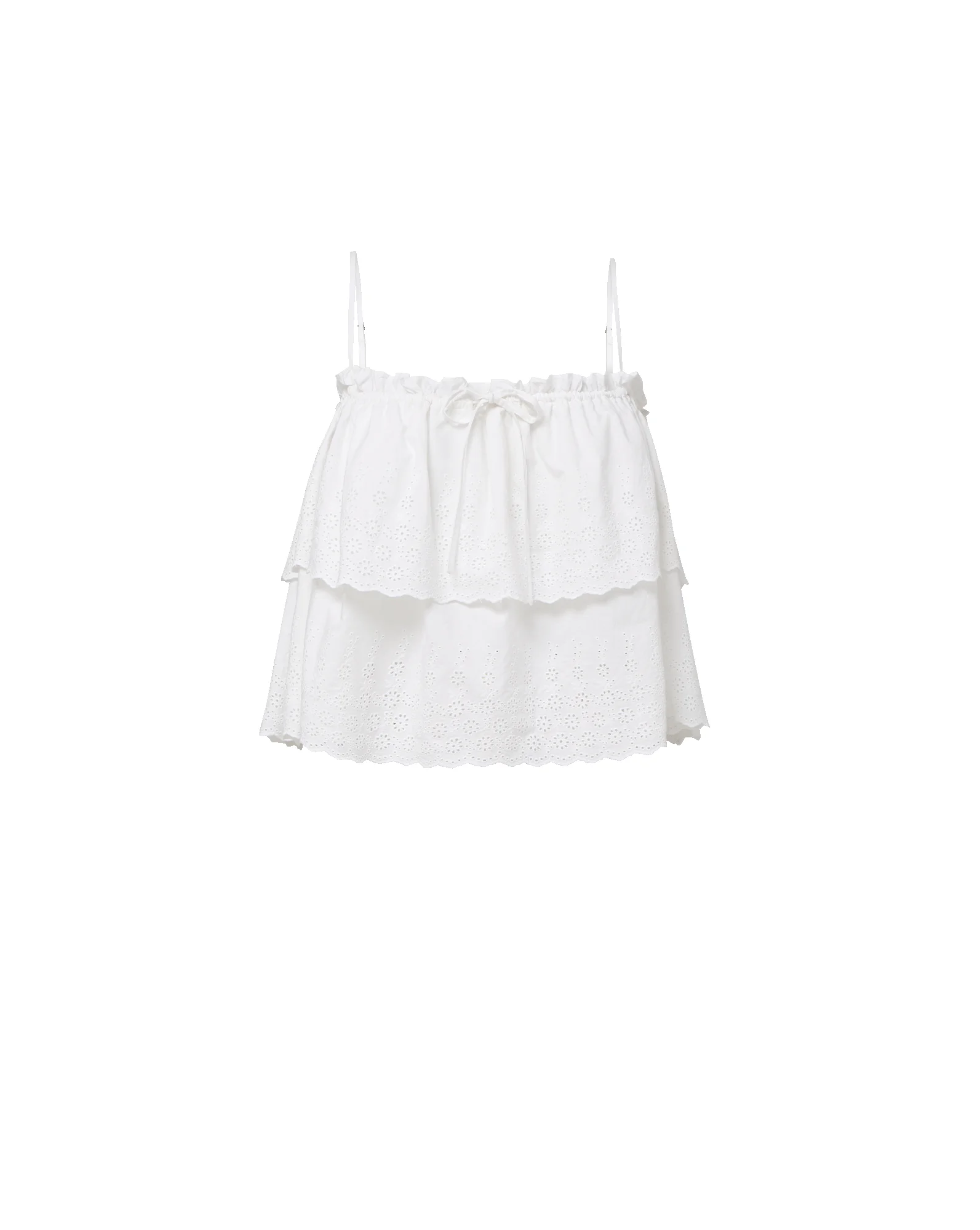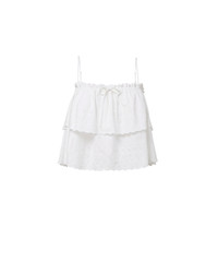 Product details Crafted from crisp white cotton poplin, the Oseanna camisole features custom scalloped eyelet embroidery and a softly tiered silhouette. An elasticized ruffle neckline and adjustable spaghetti straps create a flexible, flattering fit, while a decorative self-tie bow at the center front adds a feminine finish. Easy and lightweight, it’s the kind of top you’ll reach for all season long. Pair it with wide-leg denim and sandals for day, or style it with tailored shorts and a kitten heel for evening. - 100% Cotton - Dry clean only - Style #2604EM11941827