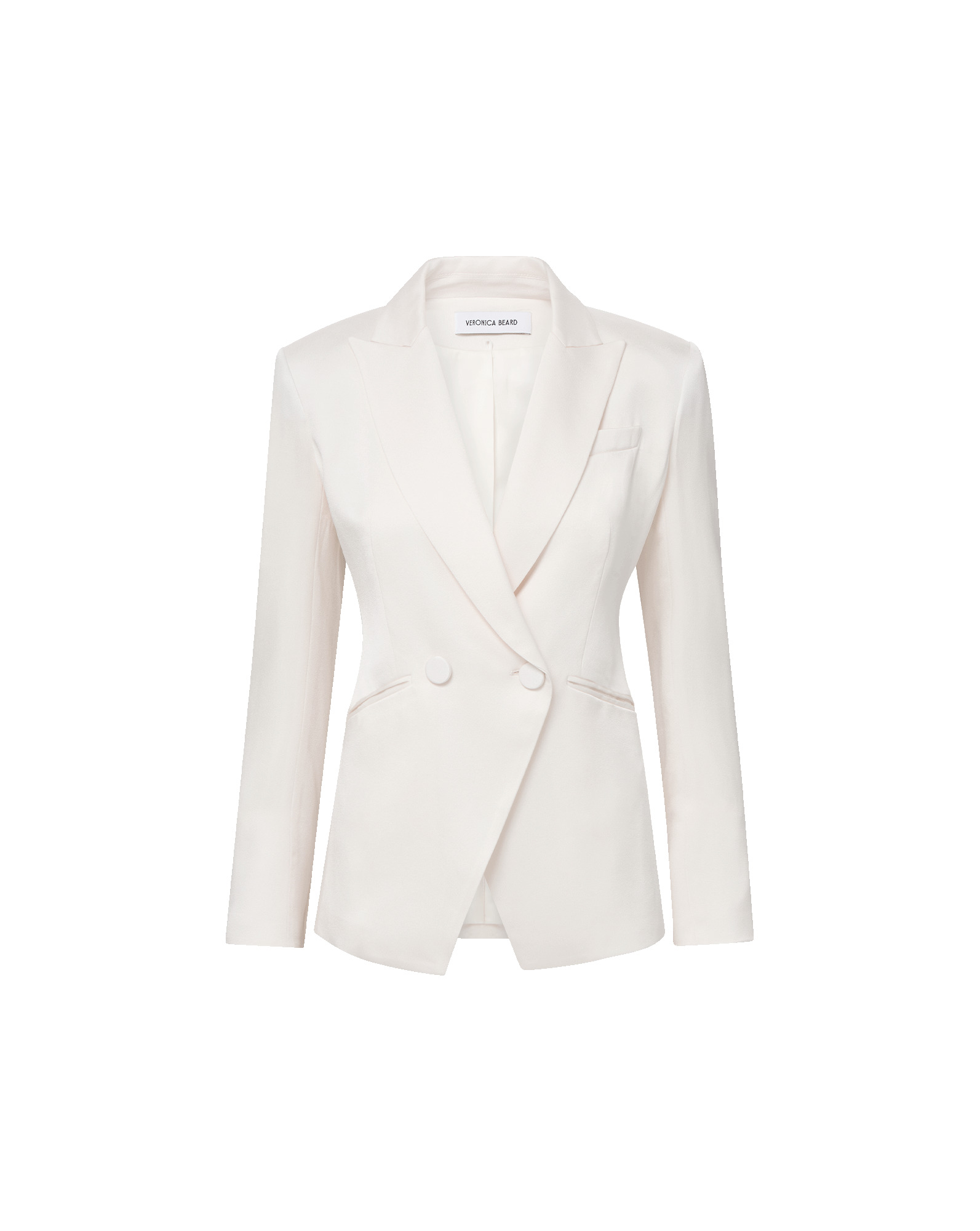 Product details A modern update to a tailored classic. Expertly crafted in the USA from premium crepe-back satin, the Rickie is an off-white tuxedo-style blazer featuring an oversized, boxy silhouette and a double-breasted closure that subtly defines the waist when fastened. Finished with a peak lapel, angled welt pockets, and tonal self-covered buttons, it's the perfect balance of polish and ease. Style it with the matching Robinne pant for a new take on the tux—then add a dickey to switch up your look. - 72% Acetate, 28% Rayon - Lining: 96% Polyester, 4% Elastane - Made in the USA - Dry clean only - Style #2510CR00410831