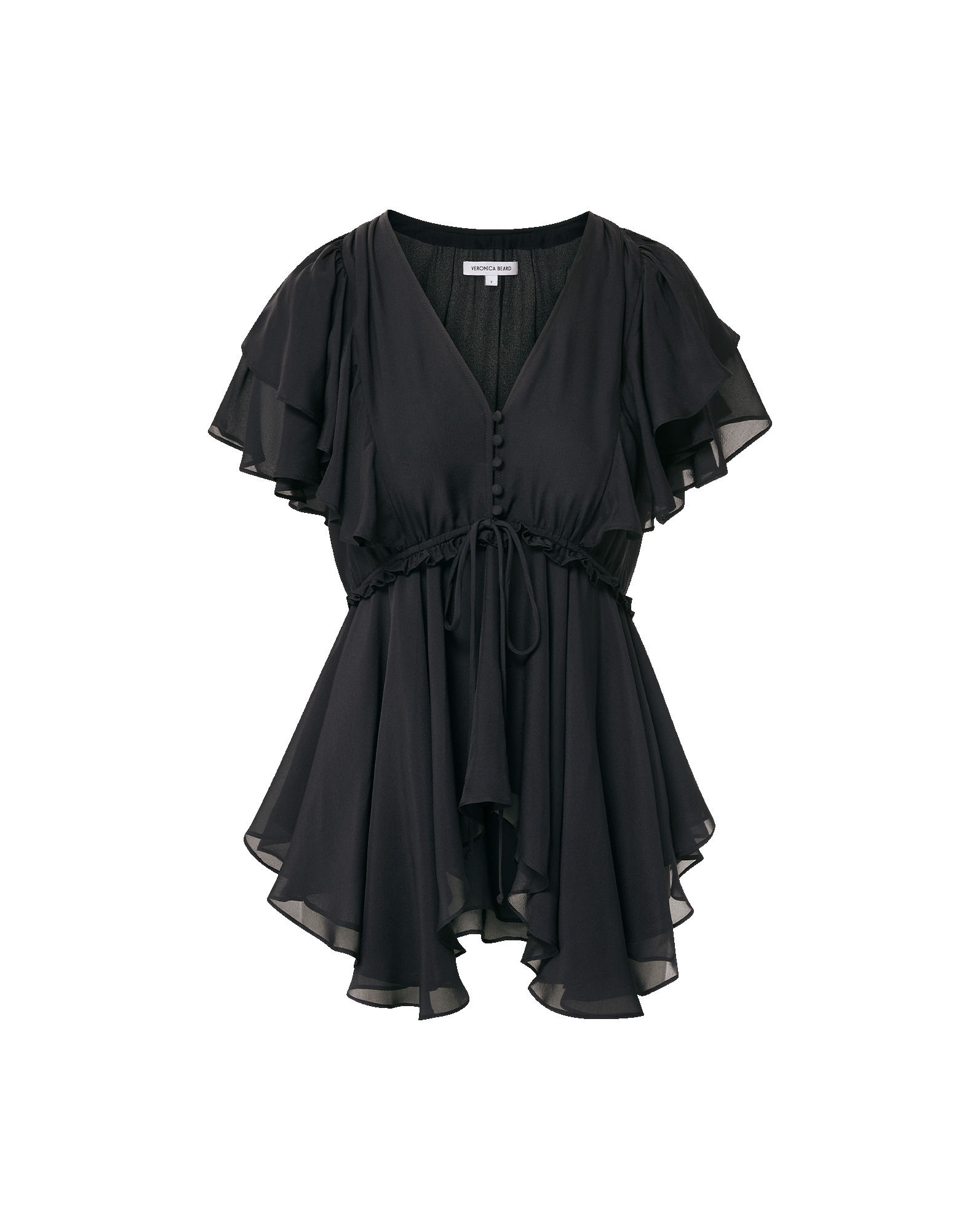Product details Whimsical drama. Crafted from premium silk with subtle sheerness, the Sammie offers an elevated take on the classic babydoll top. Designed with an elongated silhouette, it features a deep V-neckline, finished with delicate rouleau loop button details. Flutter sleeves and a ruffle-trim drawstring waist add soft definition, while the gathered handkerchief hem creates a fluid movement. Complement this statement top with a sleek trouser or mini skirt. - 100% Silk - Lining: 100% Polyester - Dry clean only - Style #2509CH3841314