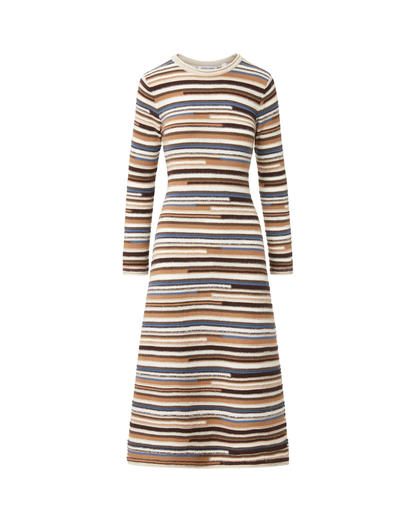Product details The essential sweater dress with flattering, feminine shape. The Sanders is spun from an Italian wool-cashmere blend for a soft, luxurious feel—perfect for cooler months. Designed to softly hug the body, it’s fitted throughout the bodice before falling to a relaxed, A-line skirt. Knit with a horizontal stripe pattern in a variety of brown, blue, and white tones, it’s finished with a classic crewneck and a braided rolled trim for an elevated touch. Pair with tall boots or ballet flats for an effortless look. - 75% Wool, 8% Cashmere, 6% Mohair, 6% Alpaca, 5% Polyamide - Fabric country of origin: Italy - Dry clean only - Style #2509KA5021768