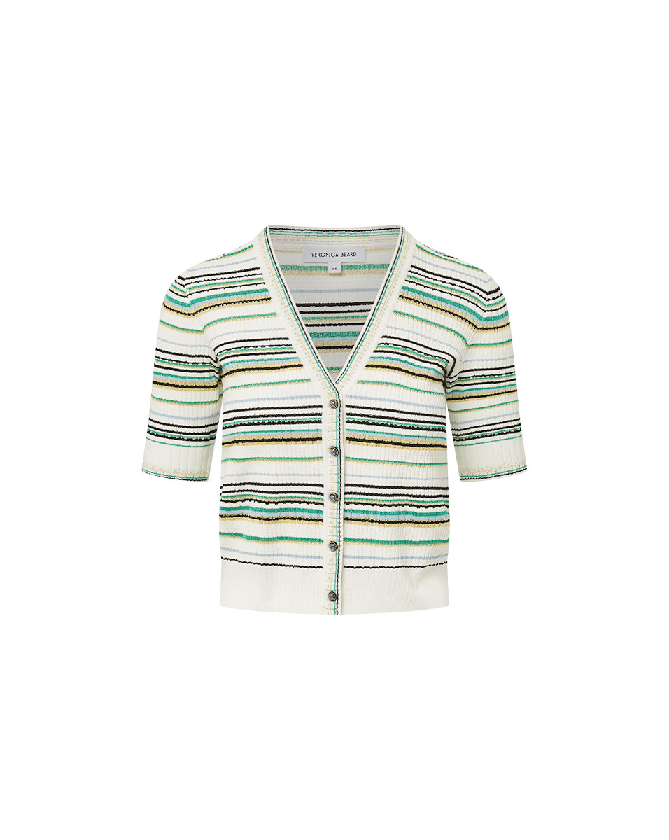 Product details Spun from a premium stretch blend, the Varia cardigan features a relaxed fit, half sleeves and multicolor stripes in vibrant green and white. Great for both weekends and wanderlust, it's a versatile layering piece that instantly elevates the everyday. Pair with the matching Carlin tank and denim shorts for a chic summer look. - 83% Viscose, 17% Polyester - Dry clean only - Style #2505KS1290427
