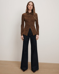 Product details A luxe take on the classic button down. Crafted in soft, buttery suede, the Wittaker shirt is cut for a slim, waist-defining fit and features a snap-front closure for ease. A cutaway hem with a raw edge completes the look. Pair with dark-wash denim to elevate the everyday, or style with the matching Gracie pant for a sleek, tonal set. - 100% Lambskin - Unlined - Professional leather cleaning only - Style #2509LT8541350