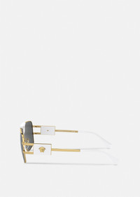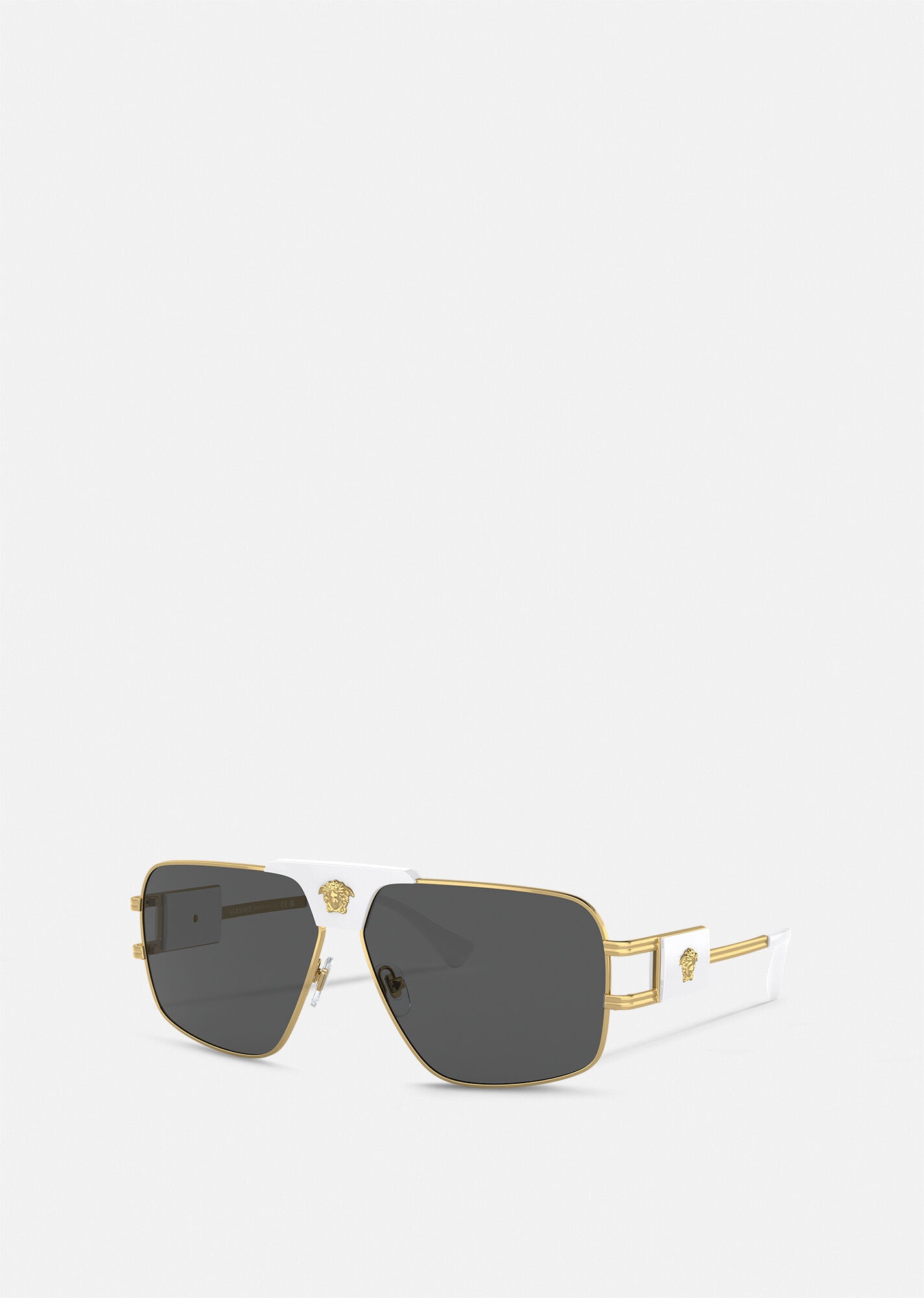 DETAILS Geometric aviator-inspired sunglasses featuring metal frames, dark tinted lenses and Medusa hardware. - Medusa hardware - Frame color: Gold-tone - Temple color: Optical white - Lens color: Dark grey - Frame: Metal - Temple: Metal Item: O2251-O14718763_RTU_TU_ONUL__ SIZE & FIT - Eye size: 24'8" in - Bridge: 4'7" in - Temple: 57'1" in