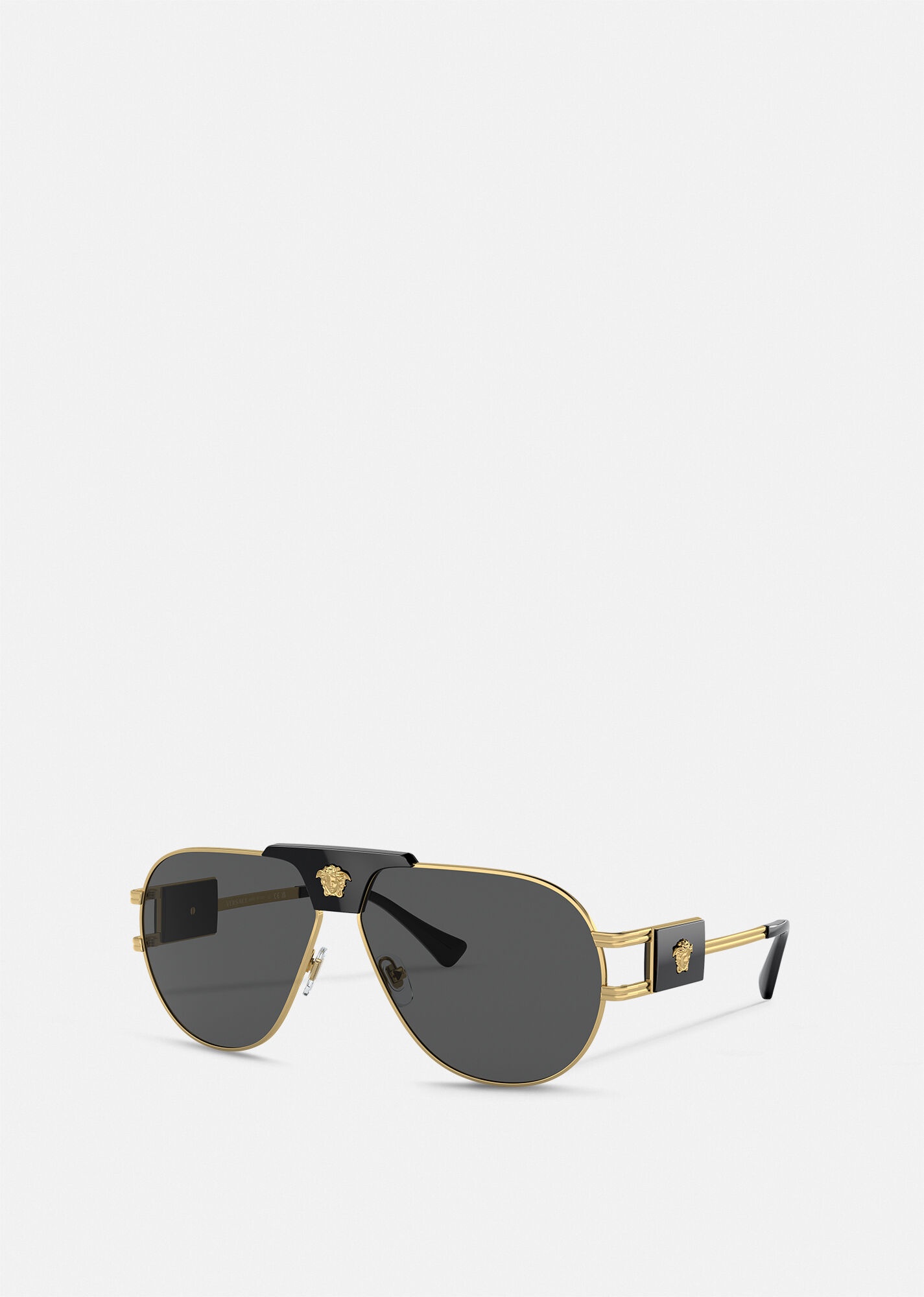 DETAILS Aviator-inspired sunglasses featuring metal frames, dark tinted lenses and Medusa hardware. - Medusa hardware - Frame color: Gold-tone - Temple color: Black - Lens color: Dark grey - Frame: Metal - Temple: Metal Item: O2252-O10028763_RTU_TU_ONUL__ SIZE & FIT - Eye size: 24'8" in - Bridge: 4'7" in - Temple: 57'1" in