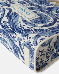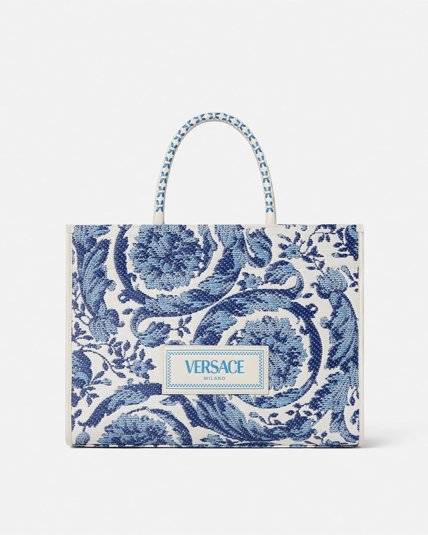 A spacious tote bag woven from raffia in the Barocco pattern featuring a leather Versace '90s Vintage Logo-embossed tag at the front. The bag is complete with tubular whip-stitched top handles, and has a detachable crossbody strap for multiple carry options. - Barocco pattern - '90s Vintage Logo patch - Top handles - Interior zip pocket - Detachable and adjustable shoulder strap - Leather feet - Outer composition: 70% Viscose, 16% Polyester, 14% Cotton - Lining: 100% Cotton - Trim: 100% Calf leather Size & Fit - L11.4 x W6.1 x H11.8" / L39 x W15.5 x H30 cm - Strap: L34.2-57.9" / L87-147 cm - Strap drop: L16.5-28.3" / L42-72 cm - Handle drop: 5.7" / 14.5 cm - Approximate weight: 42.3 oz / 1.2 kg Item: 1011562-1A11311_DTU_UNICA_6WH0V__