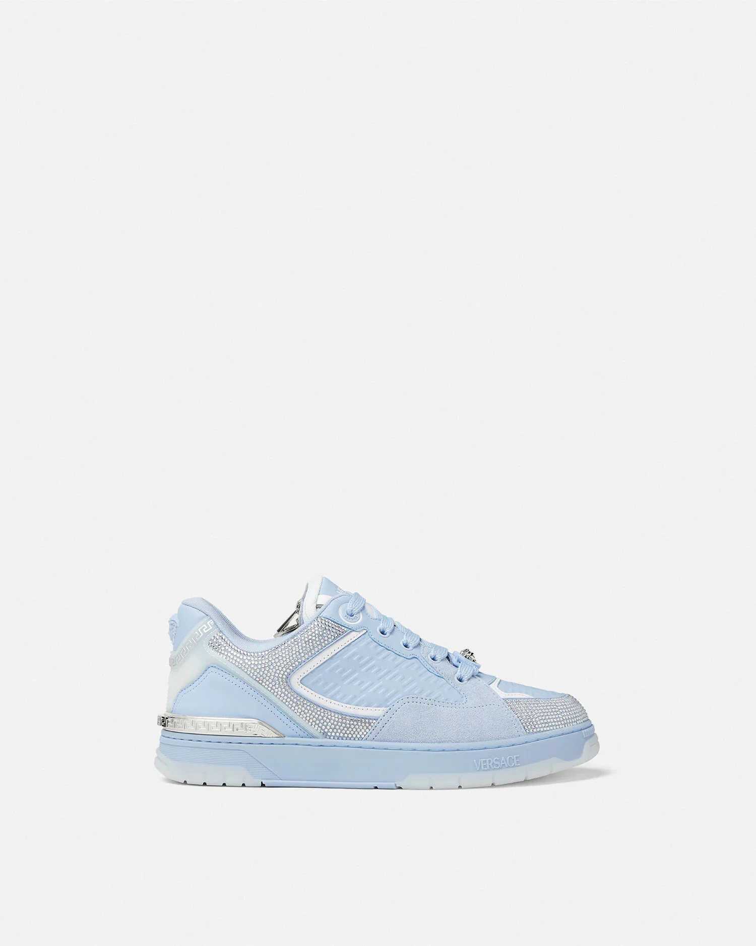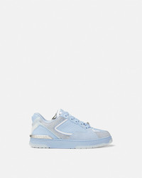 Biggie Basket offers an off-court, basketball-inspired design, characterized by signature House codes including the Medusa Biggie emblem on the laces. The low-top style provides ankle support with mesh padding on the collar and tongue, while a zipped tongue compartment adds a unique functional element. Distinctive Greca motifs are created through high-frequency leather, hand-painted patterns on the heel counter and are engraved on metal hardware. The uppers are further detailed with suede inserts and crystal embellishments. The pair comes with two lace options in different widths. - Medusa Biggie hardware - Medusa hardware - Versace Logo motif - Greca motif - Crystal embellishments - Low top - Round toe - Zipped tongue compartment - Laces 2-set - Outer composition: 52% Polyester, 48% Nylon - Lining: 100% Polyester - Trim: 100% Calf leather - Sole: 100% Rubber Size & Fit - The shoe weighs approximately 24.7 oz / 0.7 kg for the model size 44 IT - Footbed: comfortable - Fits true to size, take your normal size Item: 1020593-1A14763_1VD9P