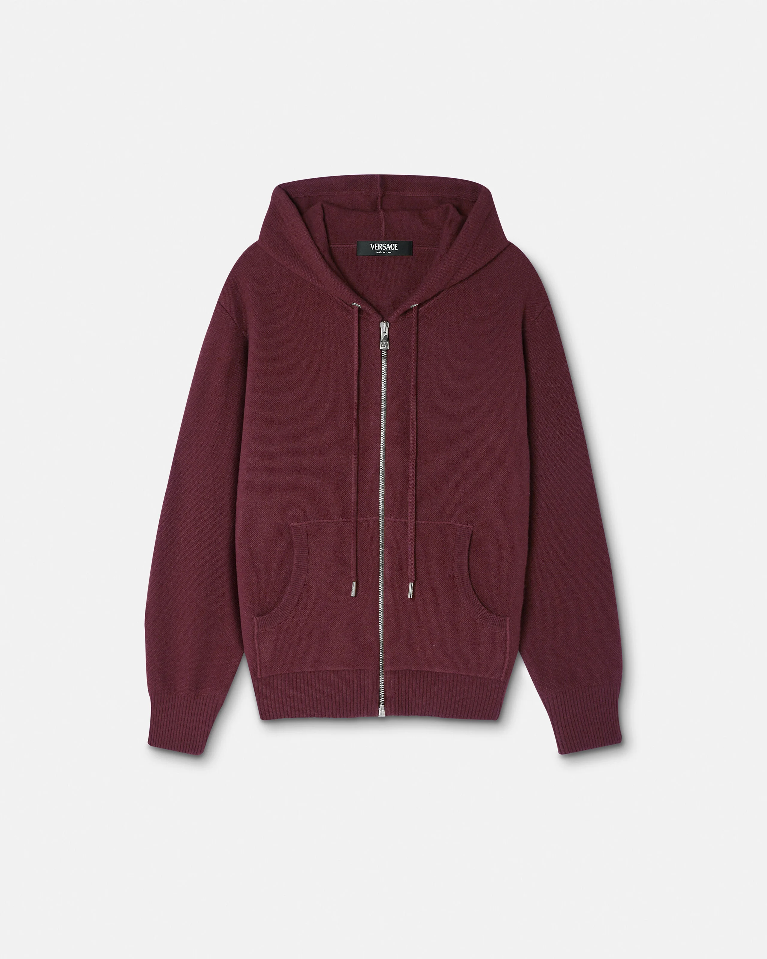 This wool and cashmere knit hooded sweatshirt has a relaxed fit with ribbed trims and is detailed with a tonal towel-stiched terry Medusa motif at the back. - Medusa motif - Long sleeves - Drawstring hood - Front zip closure - Ribbed trims - Outer composition: 70% Wool, 30% Cashmere - Yarn made from responsibly sourced wool Size & Fit - The model is 5'10" tall and wears size 38 IT Item: 1013428-1A10005_1RD90