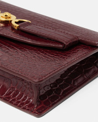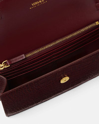 An embossed croc-effect calf leather clutch featuring a Medusa '95 hardware at the front, multiple interior card slots, a spacious slip pocket and a zipped pocket. The accessory has a thin removable chain strap for optional crossbody wear. - Medusa '95 hardware - Magnetic closure - 6 card slots - Slip pocket - Zipped pocket - Detachable chain strap - Outer Composition: 100% Calf Leather - Lining: 60% Cotton, 40% Viscose - Trim: 100% Lambskin Size & Fit - L7.7 x W1.6 x H4.5" / L19.5 x W4 x H11.5 cm - Shoulder strap: L40.9" / L104 cm - Shoulder strap drop: L19.7" / L50 cm - Approximate weight: 10.6 oz / 0.3 kg Item: 1020075-1A08724_DTU_UNICA_1R70V__