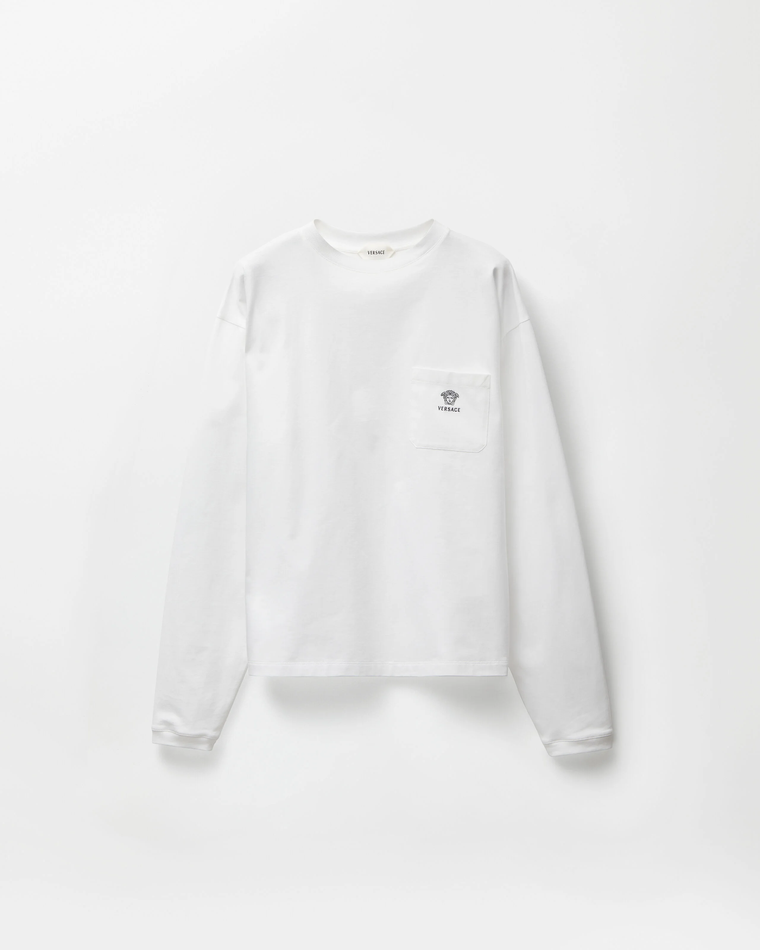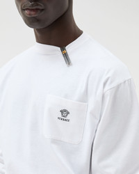A long-sleeved T-shirt in compact cotton jersey featuring a thread-embroidered Medusa and Versace Logo on the chest patch pocket. - Versace Logo embroidery - Medusa embroidery - Long sleeves - Crewneck - Chest patch pocket - Outer composition: 100% Cotton - Embroidery: 100% Polyester - Trim: 100% Cotton Size & Fit - The model is 6'2" / 1.89 m tall and wears size 48 IT Item: 1024573-1A17915_1W000
