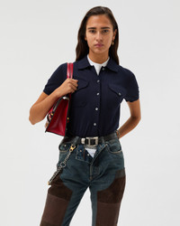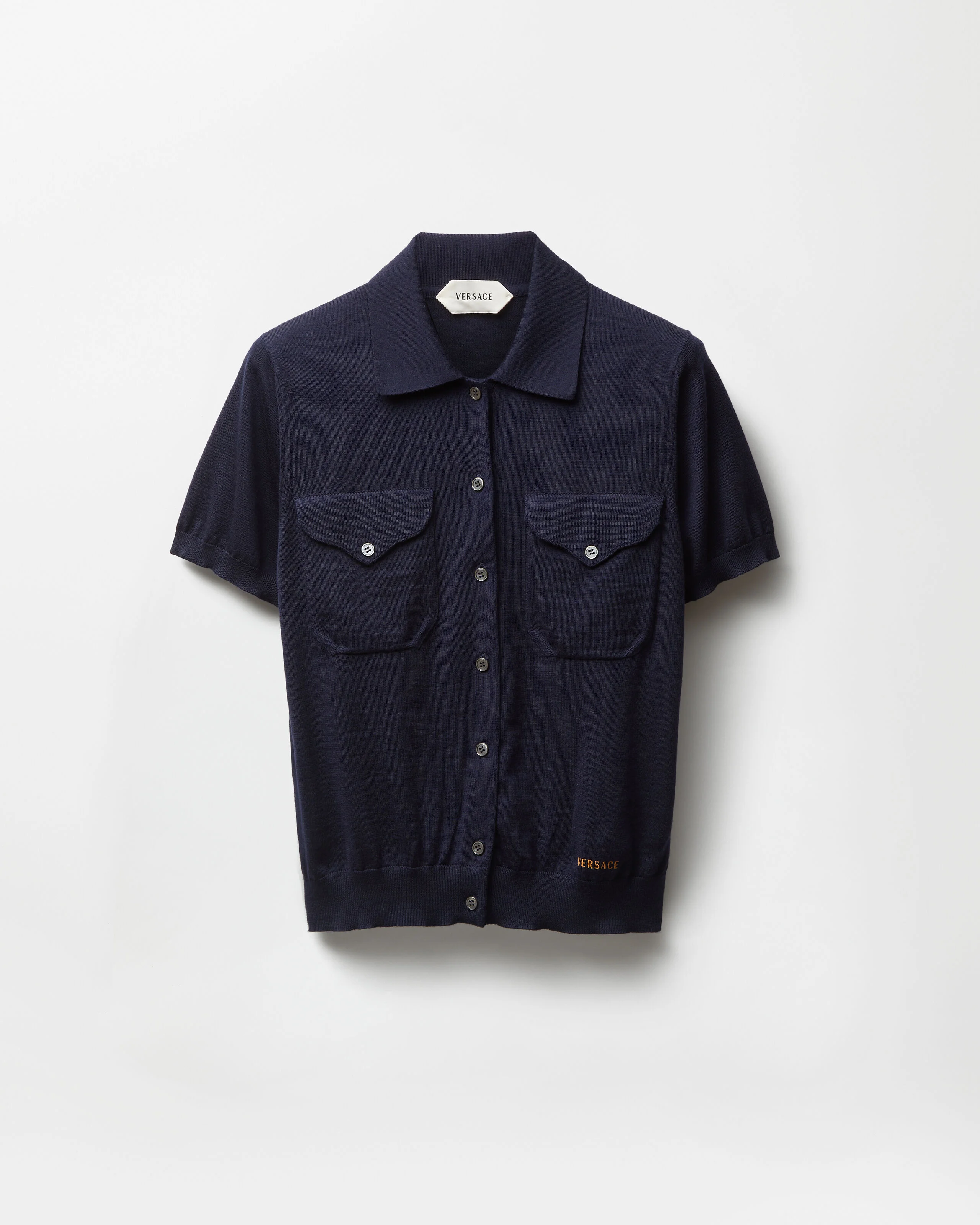A short-sleeved button-down cardigan knit from wool featuring a polo collar, chest pockets, and a Versace Logo thread-embroidery at the front. - Versace Logo embroidery - Short sleeves - Pointed collar - Front button closure - Front flap pockets - Ribbed trims - Outer composition: 100% Pure virgin wool - Embroidery: 100% Polyester - Trim: 83% Pure virgin wool, 13% Polyamide, 4% Elastane Size & Fit - The model is 5'10" / 1.77 m tall and wears size 38 IT Item: 1024365-1A17408_1U040
