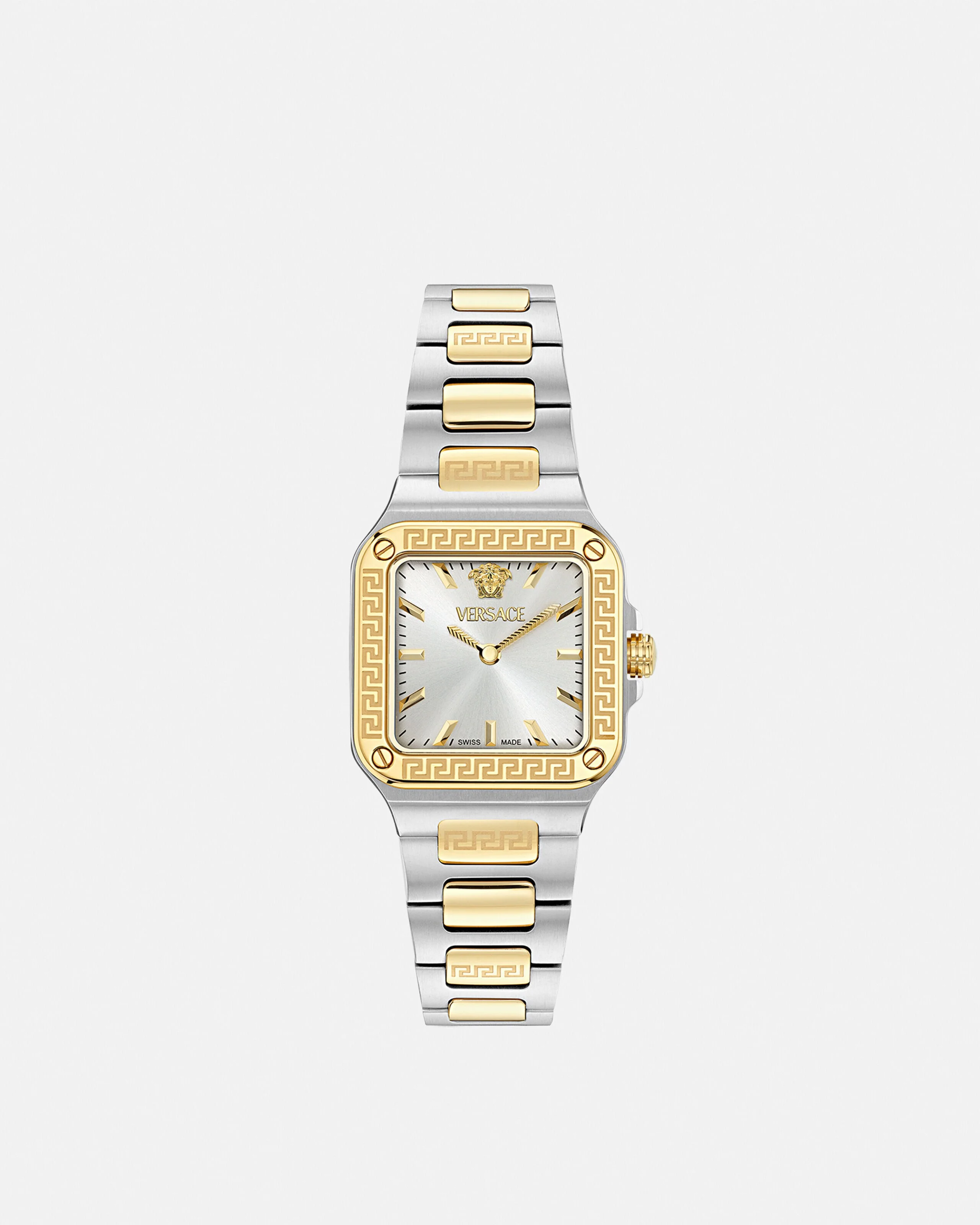 Greca Edge is a declaration of intent: bold, architectural and unmistakably Versace. Its square case, defined by engraved Greca motif and polished screws, articulates strength and precision, echoing the discipline of classical architecture. Beneath its geometry, a glimmering sunray dial softens its rigor with resplendent light. The Medusa dominates at 12 o'clock. All Versace watches are guaranteed by the 'Swiss Made' marking. All stainless steel is recycled. - Case: Bicolour (SS&IP2N) case - Dial: White sunray dial with decorative screws and Greca on the top ring / Medusa and Versace Logo at 12h - Bracelet: Bicolour (SS&IP2N) band with butterfly buckle and Greca motif - Movement: RONDA 762.3 Swiss Quartz 2-hands movement - Water Resistant: 5 ATM Size & Fit - Case: 1.2x1.2" / 30x30 mm Item: PVE5G002-P0026_RTU_TU_PNUL__