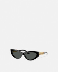 DETAILS A cat-eye shape, these sunglasses have acetate frames and are accented by an open Greca motif with strass embellishments at the temples. - Greca motif - Frame color: Black - Temple color: Black - Lens color: Dark gray - Frame: Acetate - Temple: Metal Item: O4470B-OGB18756_RTU_TU_ONUL__ SIZE & FIT - Eye size: 2.2" - Bridge: 0.6" - Temple: 5.5"