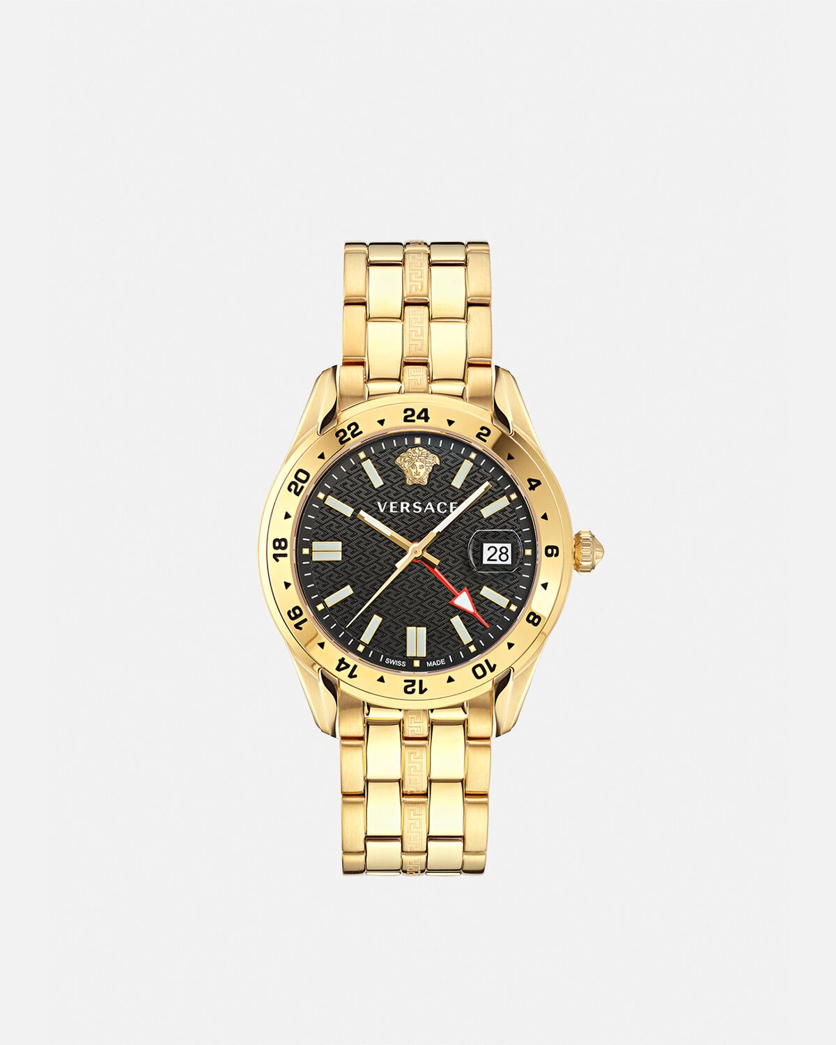 DETAILS The modern timepiece is characterised by a tachymeter on the top ring. The dial features a tonal Greca pattern and a three-dimensional Medusa emblem at 12 o'clock. The model is updated with a GMT movement and has a window date with magnifying glass located at three o'clock. It's complete with a metal band strap. All Versace watches are guaranteed by the 'Swiss Made' marking. - Case: IP2N case with tachymeter on top ring - Dial: Black dial with 3D Greca pattern / Versace logo and Medusa at 12h - Bracelet: P2N band with butterfly buckle - Movement: RONDA 515 Swiss Quartz GMT movement / date at 3h - Water Resistant: 5 ATM Item: PVE7C007-P0023_RTU_TU_PNUL__ SIZE & FIT - Case: 1.6"