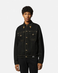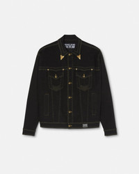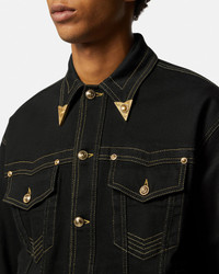 DETAILS A loose-fit denim blouson jacket with contrast top-stitching, featuring accent V-Emblem hardware, Western-inspired collar tips, and a back Institutional logo patch. - V-Emblem hardware - Institutional logo - Long sleeves - Pointed collar - Front button closure - Chest flap pockets - Side pockets - Outer composition: 99% Cotton, 1% Elastane - Lining: 65% Polyester, 35% Cotton Item: E76GAS40B-EDW060L54_E909 SIZE & FIT - The model is 6'3" tall and wears size 48 - All sizes fit Italian standards