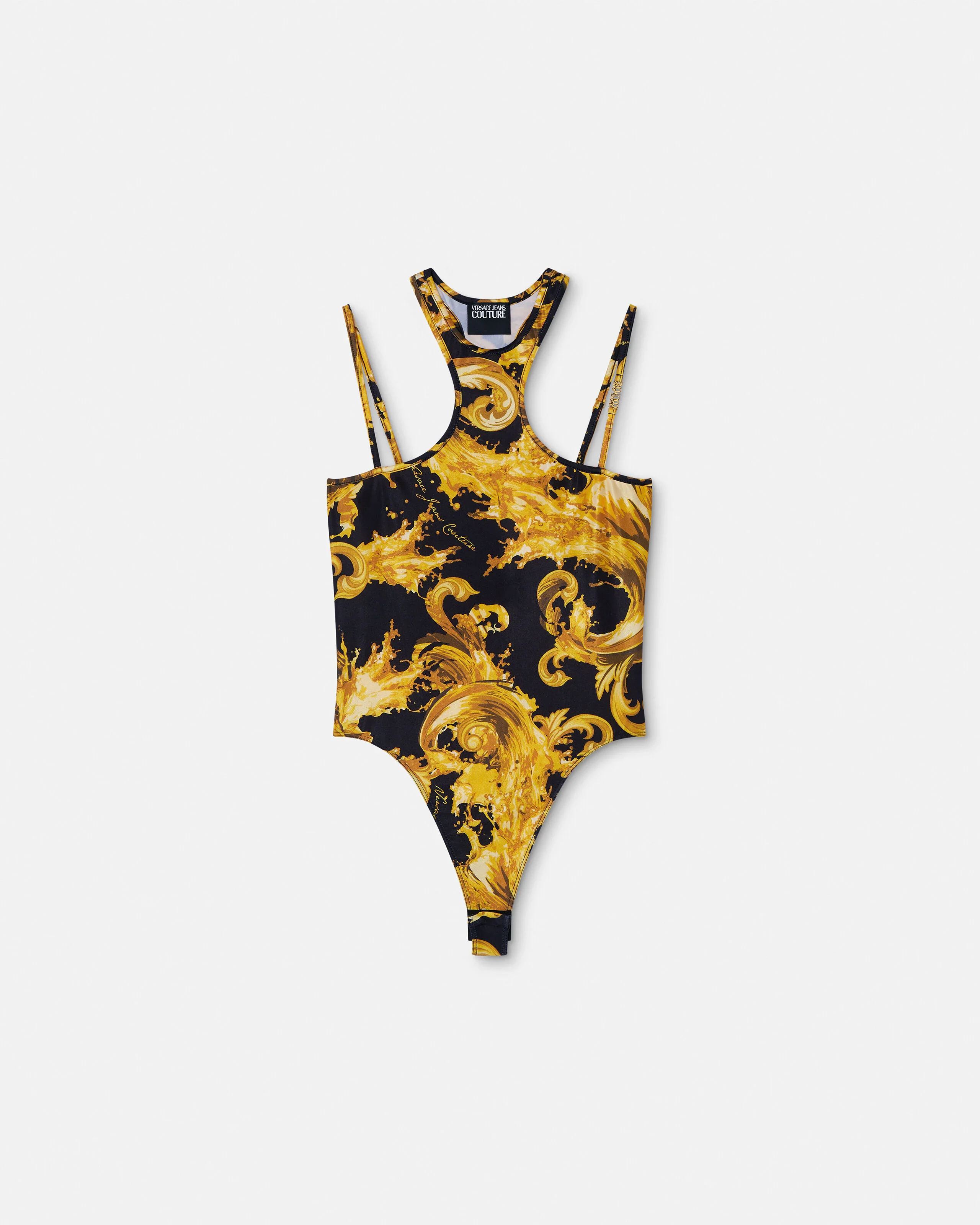 A sleeveless bodysuit with an off-shoulder design, featuring an all-over Wave Couture print and Institutional Logo hardware on the shoulder strap. - Wave Couture print - Institutional Logo hardware - Sleeveless - Adjustable shoulder straps - Off-shoulder design - Halterneck - Snap-buttoned closure - Outer composition: 80% Polyester, 20% Elastane Item: E80HAM211-EJS532_EG89