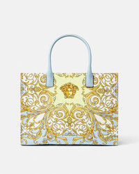 This spacious tote bag is crafted from canvas with leather top handles and features an all-over Spring Barocco print, detailed with front Medusa hardware. It has leather raised Versace logo lettering and is complete with two zippered pockets and a leather protector strap. The front D-ring provides an optional attachment for a keychain or charm. - Spring Barocco print - La Medusa hardware - Versace logo lettering - Top handles - Two interior zippered pockets - Leather feet - Outer composition: 100% Cotton - Lining: 100% Cotton - Trim: 100% Calf leather Size & Fit - L15.7 x W6.3 x H11.8" / L40 x W16 x H30 cm - Handle drop: L6.3" / L16 cm Item: 1004741-1A17148_DTU_UNICA_5UD6V__