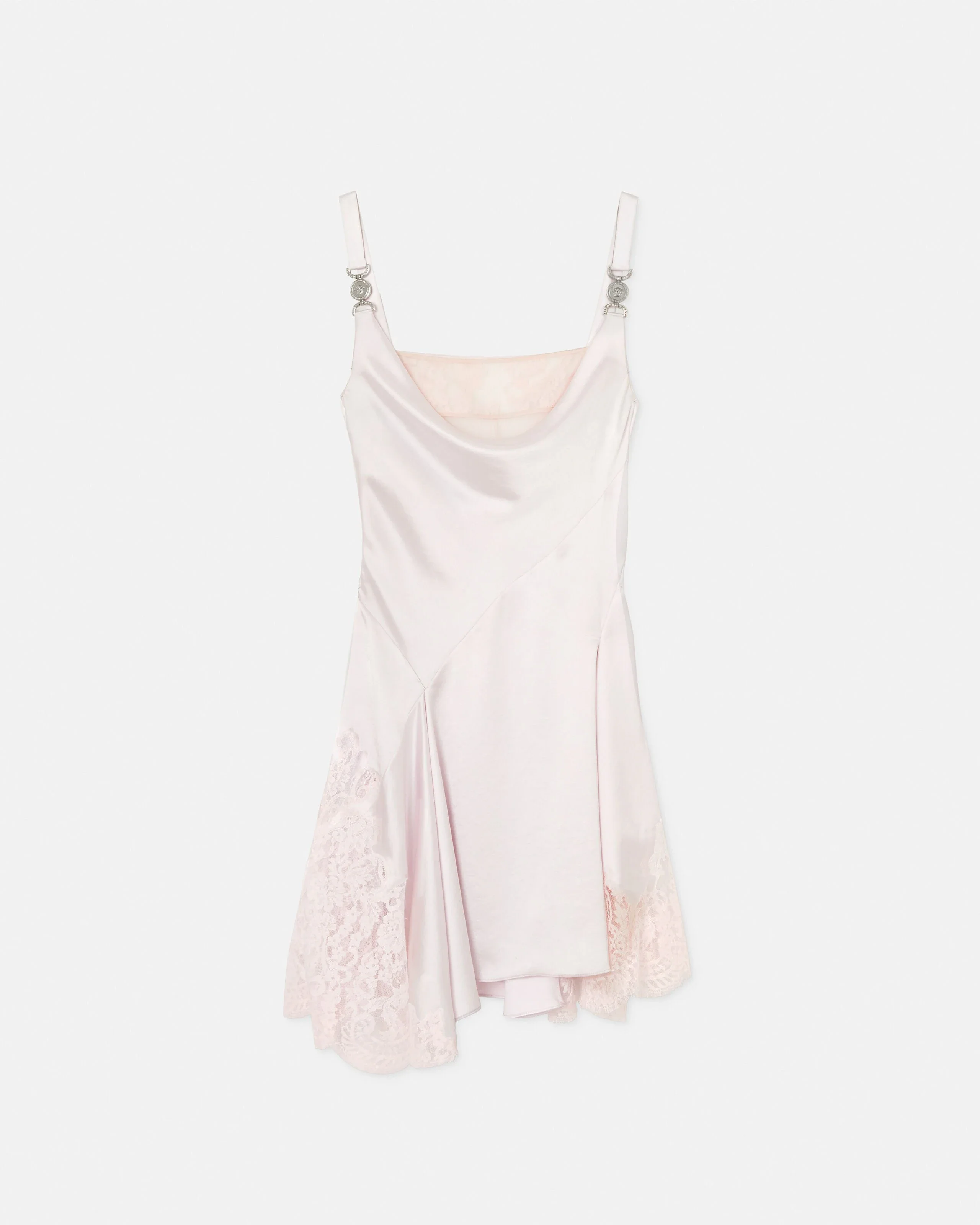 A sleeveless mini dress with a satin finish featuring lace inserts and Medusa '95 hardware on shoulder straps. Bias cuts detail the fluid slip silhouette with a cowl neckline. - Medusa '95 hardware - Sleeveless - Shoulder straps - Cowl neckline - Concealed side zip closure - Slip dress - Outer composition 1: 100% Polyester - Outer composition 2: 78% Cotton, 22% Polyamide - Lining: 100% Silk - Trim: 100% Silk Size & Fit - The model is 5'10" / 1.79 m tall and wears size 38 IT Item: 1022382-1A12921_1PX20