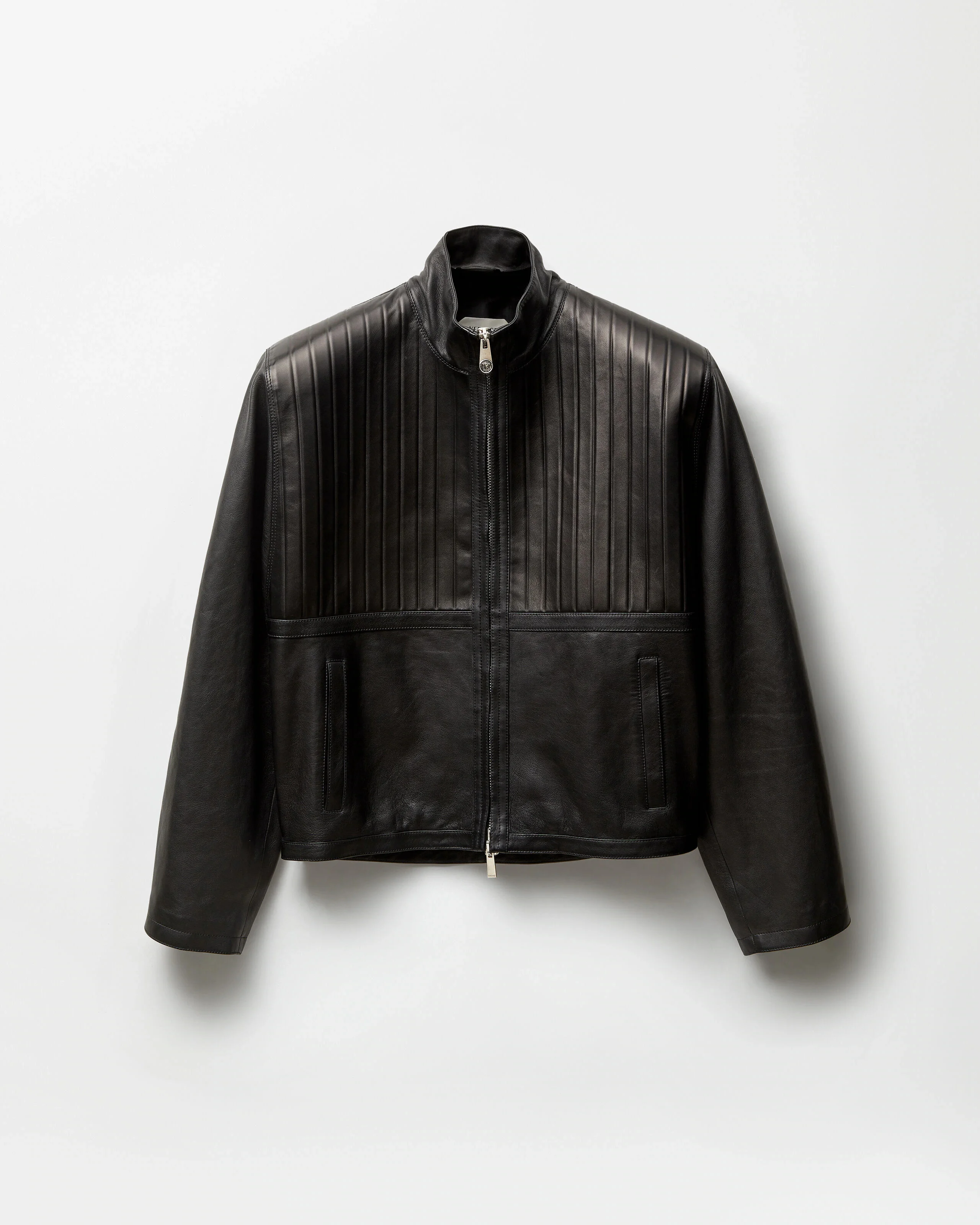 A zipped plonge leather blouson jacket with embossed panels and an embossed Versace Logo at the back collar. - Versace logo embossing - Long sleeves - High neck - Front zip closure - Side pockets - Interior welt pockets - Fully lined - Outer composition: 100% Lambskin - Lining 1: 100% Viscose - Lining 2: 100% Cotton Size & Fit - The model is 6'0" / 1.84 m tall and wears size 48 IT Item: 1024016-1A17483_1B000