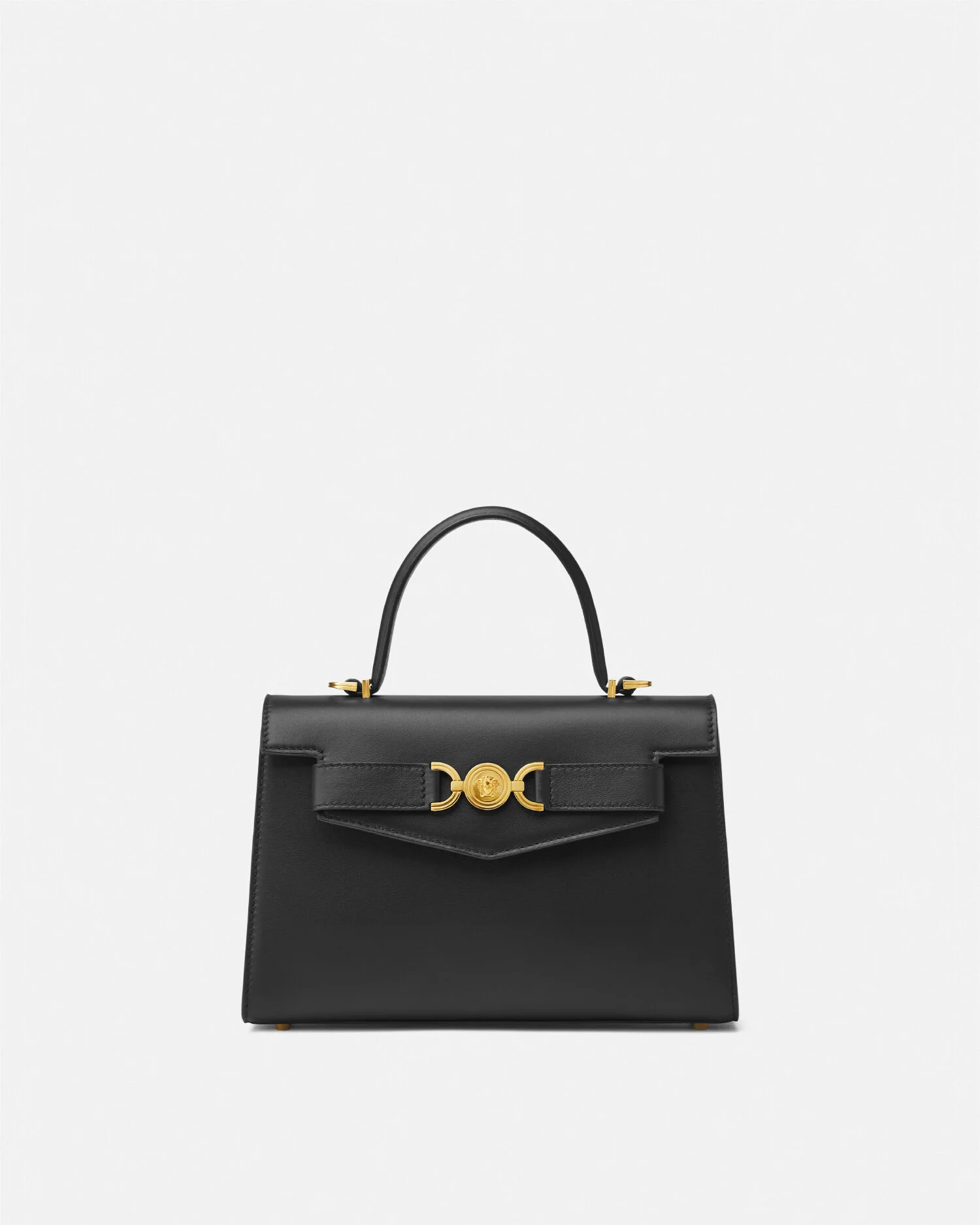 DETAILS A medium-sized handbag with belt detail featuring the Medusa '95 hardware, the iconic House code first seen in the 1995 collections. The top handle design is made from smooth, flat-grain leather with a magnetic foldover flap and a detachable crossbody shoulder strap. - Medusa '95 hardware - Versace logo embossing - Top handles - Foldover magnetic closure - Two internal slip pockets - Adjustable and detachable shoulder strap - Metal feet - Outer composition: 100% Calf leather - Lining: 100% Lambskin Item: 1013823-1A10795_DTU_UNICA_1B00V__ SIZE & FIT - L10.2" x W3.3" x H7.5" - Strap: L42.5"-45.7" - Drop: L3.7" - Approximate weight: 21.2 oz
