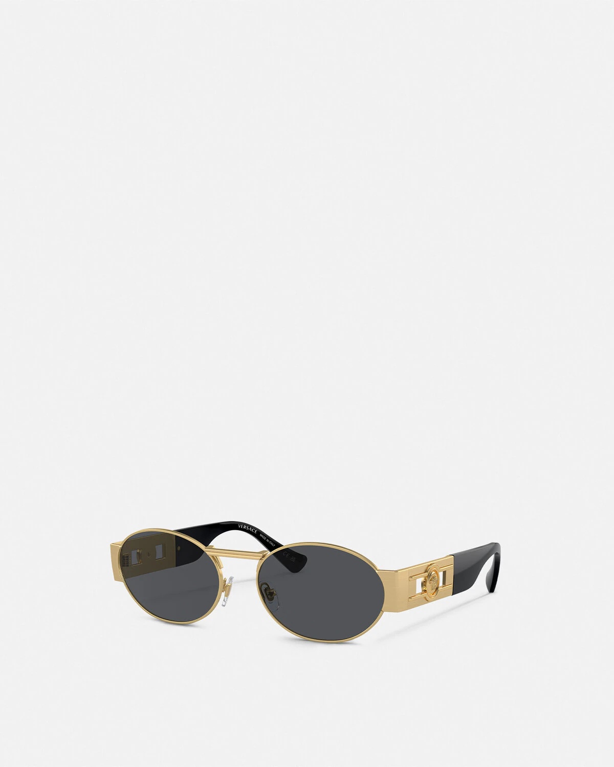 DETAILS Oval frame sunglasses defined by geometric lines at the nose bridge and temples, accented by a Medusa hardware at the side. - Medusa hardware - Frame color: Gold-tone - Temple color: Gold-tone - Lens color: Dark Gray - Frame: Metal - Temple: Metal Item: O2264-O10028756_RTU_TU_ONUL__ SIZE & FIT - Eye size: 2.2"