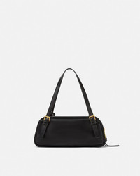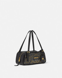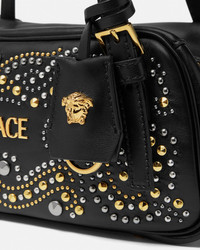 DETAILS The Versace Tag bowling shoulder bag is crafted from ultrasoft nappa leather and features stud embellishments throughout The versatile accessory is accented by metal Versace Logo lettering and can easily be carried over the shoulder or inhand by the adjustable leather handles A removable leather tag keychain with Medusa hardware completes the design - Medusa hardware - Versace Logo lettering - Top zip closure - Adjustable top handles - Interior slip pocket - Removable keychain tag - Outer Composition: 100% Lambskin - Lining: 100% Polyester Item: 1015792-1A16316_1B00V SIZE & FIT - L10.6 x W3.9 x H4.7" / L27 x W10 x H12 cm - Handle drop: 9.8" / 25 cm - Approximate weight: 14.1 oz / 0.4 kg