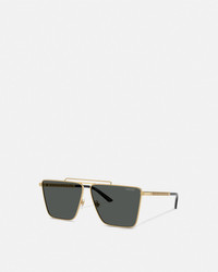 DETAILS These sleek rectangular sunglasses are characterised by a double nose bridge and a tubular Greca motif at the temples. - Greca motif - Frame color: Gold - Temple color: Gold - Lens color: Dark gray - Frame: Metal - Temple: Metal Item: O2266-O10028764_RTU_TU_ONUL__ SIZE & FIT - Eye size: 2.5" - Bridge: 0.4" - Temple: 5.7"
