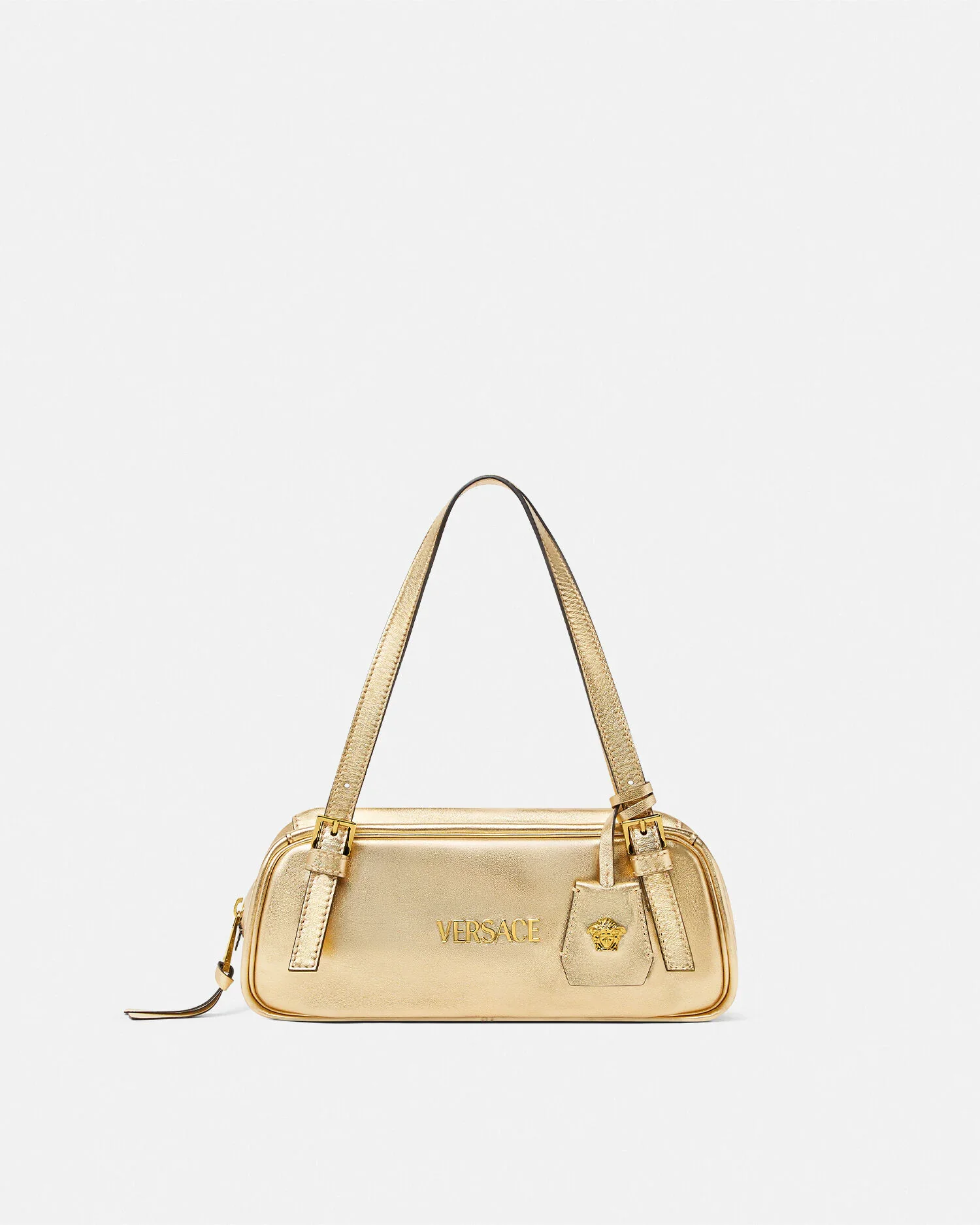 The Versace Tag bowling shoulder bag is crafted from metallic laminated nappa leather. The versatile accessory is accented by metal Versace Logo lettering and can easily be carried over the shoulder or in-hand by the adjustable leather handles. A removable leather tag keychain with Medusa hardware completes the design. - Medusa hardware - Versace Logo lettering - Top zip closure - Adjustable top handles - Interior slip pocket - Removable keychain tag - Outer composition: 100% Lambskin - Lining: 100% Polyester Size & Fit - L10.6 x W3.9 x H4.7" / L27 x W10 x H12 cm - Handle drop: L9.8" / L25 cm - Approximate weight: 14.1 oz / 0.4 kg Item: 1015792-1A15180_DTU_UNICA_1X23V__