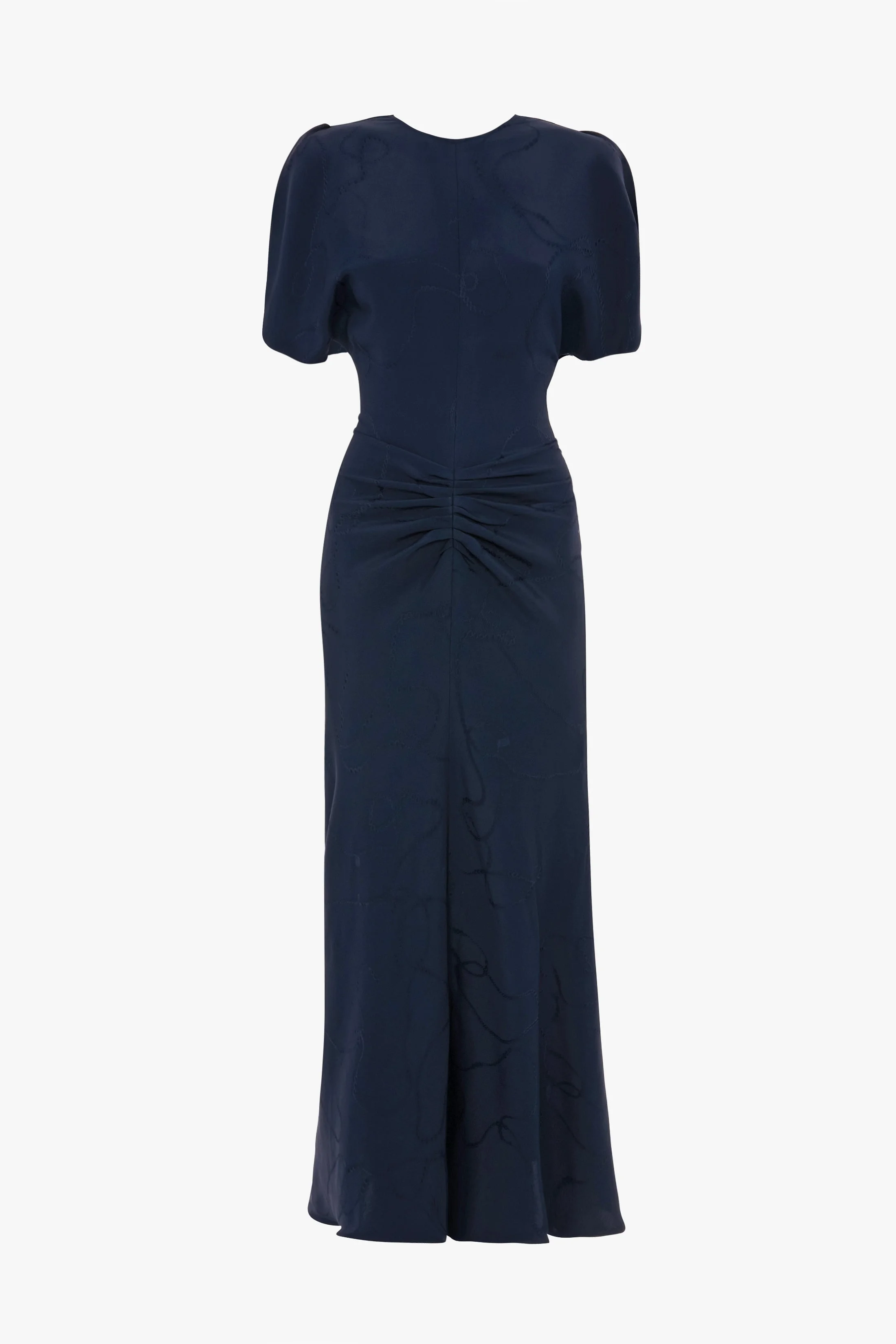 - Midi length - Fluid fabrication - Round front neckline - V-shape back - Short sleeve - 95% Polyester 5% Elastane - Dry clean only - Made in Portugal Crafted from a distinctive pearl jacquard, the Gathered Waist Midi Dress in Navy has a modest front round neckline and an unexpected V-neck at the back. Pretty short sleeves and a tactile gathered detail at the front complete the look. SIZE & FIT - Fits true to size, take your normal size