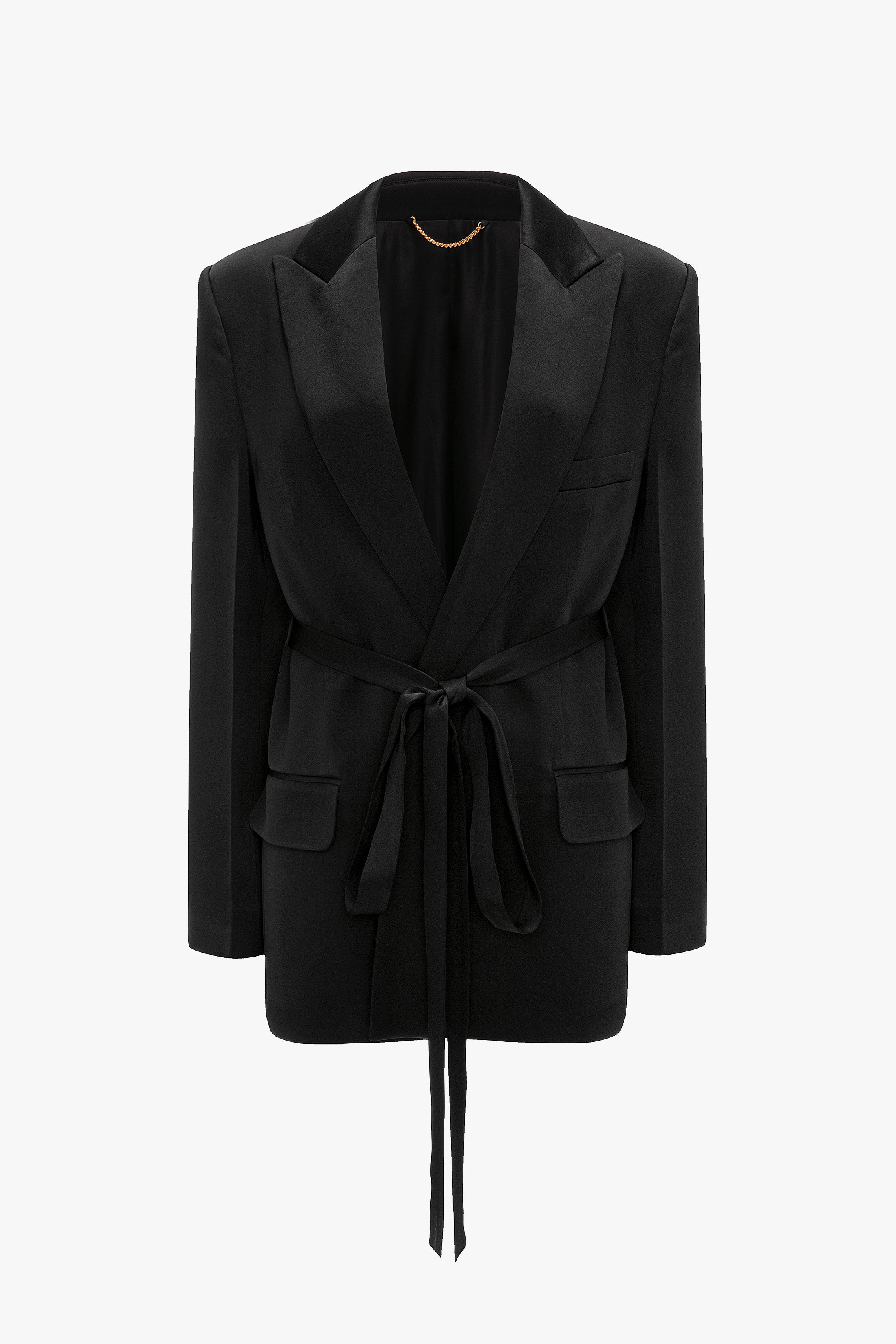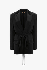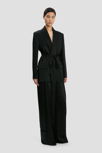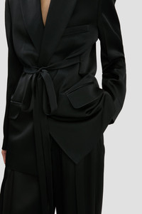 The Tailored Belted Jacket in Black embraces a feminine take on traditional suiting with its waist-defining fabric belt. Crafted from fluid crepe back satin and fully lined, it has sharp creases down the front and back sleeves, bringing subtle definition to the silhouette. Front patch pockets add an attractive and practical design detail and the classic colourway gives this piece wear-anywhere appeal. Size & Fit - The model height is 5'11’’/180.5cm and is wearing a size 8 - Fits true to size, take your regular size Product Details - Satin crepe tailored jacket fabrication with belt - Concealed button closure - Fully lined - Internal chest pocket - External chest pocket with welt - Patch pockets at the front with contrast black pocket flap lining - Sharp creases on front & back sleeve - 71% Acetate, 29% Viscose - Dry Clean Only - Made in UK