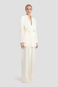 The Belted Jacket in Ivory redefines modern tailoring with a sense of effortless sophistication. Crafted from fluid satin crepe, it drapes elegantly over the frame, cinched at the waist with a self-tie belt for a sculpted silhouette. Sharp creases along the front and back sleeves enhance its structured appeal, while the fully lined construction ensures a seamless finish. A statement in refined minimalism, this piece is designed to transition seamlessly from day to evening. Size & Fit - Fits true to size, take your regular size Product Details - Satin crepe tailored jacket fabrication with belt - Concealed button closure - Fully lined - Internal chest pocket - External chest pocket with welt - Patch pockets at the front with contrast white pocket flap lining - Sharp creases on front & back sleeve - 71% Acetate 29% Viscose