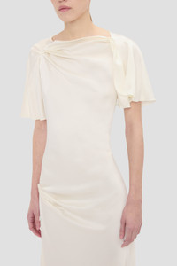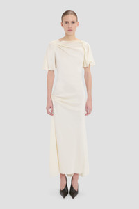 Beautifully draped to flatter the body, the Cap Sleeve Midi Dress has an elegant asymmetric hemline and neckline. Tactile pleating at the waist and a V-shape back bring a sensual undertone. Presented in nostalgic Ivory, it is a polished but provocative piece of ready-to-wear. - Midi length with asymmetric hem - Drape fabrication - Draped neckline - Covered back - Cap sleeve - Contrast stitching - Concealed zip with hook & eye closure - Unlined - 71% Acetate 29% Viscose - Dry clean only - Made in Portugal SIZE & FIT - Fits true to size, take your normal size - The model height is 5’9”/175cm and is wearing a size 6