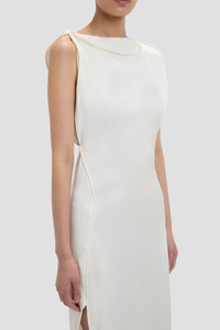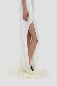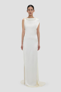 Size & Fit - Fits true to size, take your normal size - Floor-length with long back train - Fluid fabrication - Draped neckline - Sleeveless - 71% Acetate 29% Viscose - Dry clean only - Made in Portugal A floor-pooling hemline with long back train brings quiet drama to the Carla Gown. Presented in nostalgic Ivory, it is crafted from crepe back satin for a sensuous, figure-flattering drape. A provocative side split adds a sexy undertone.