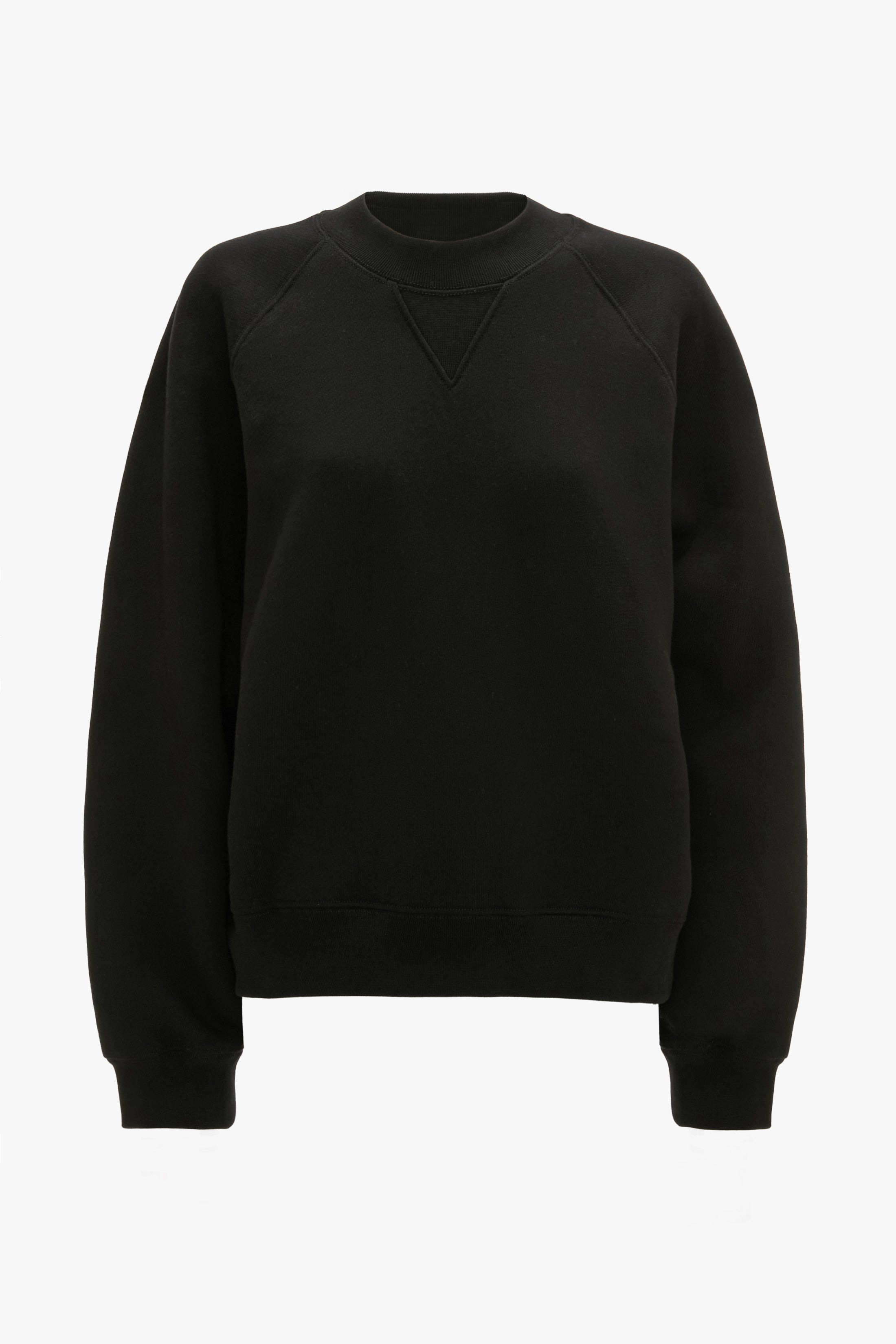 A boxy fit brings a boyish undertone to the Crew Neck Raglan sweatshirt. Presented in utilitarian Black and crafted from a heavyweight fleeceback cotton jersey, it has a classic crew neck with a triangle insert for visual interest. A ribbed hemline and cuffs and a tonal embroidered Victoria Beckham monogram at the back of the neck complete the look. Size & Fit - Fits true to size, take your regular size - The model height is 5'11’’/180cm and is wearing a size S Product Details - Boxy fit - Crew neck with triangle v insert at front - Raglan sleeve - Ribbed hem and cuff - Back neck tonal VB embroidery - Heavyweight fleeceback cotton jersey - 100% Cotton - Machine Wash at 30C - Made in Portugal