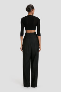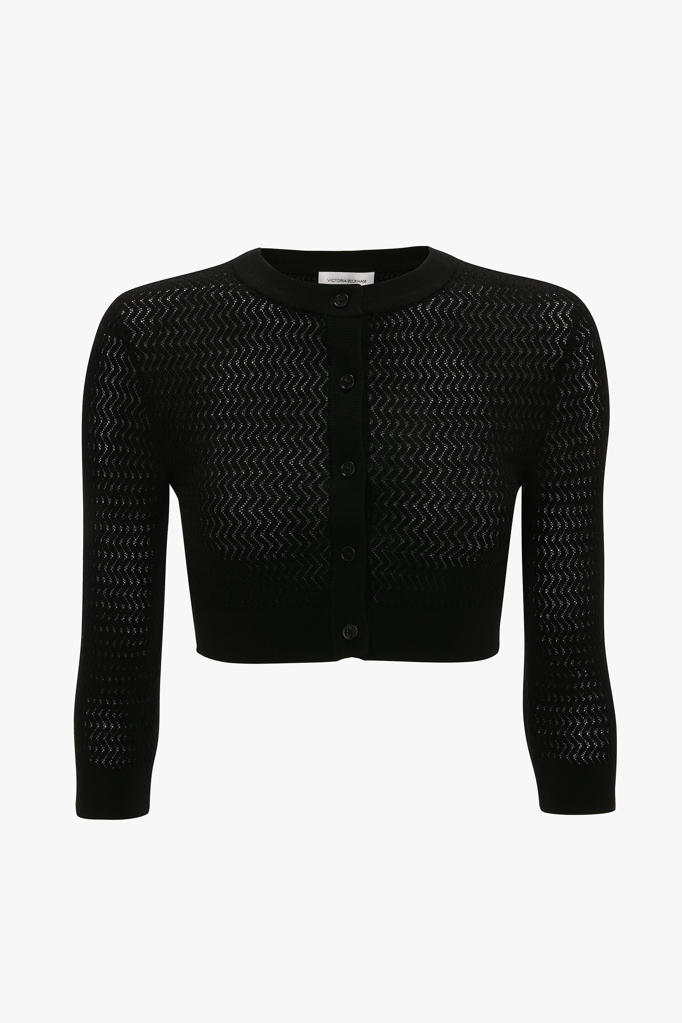 Unapologetically feminine, the Cropped Sleeve Cardigan has a figure-flattering silhouette and an attractive textured zig zag stitch. Ribbed trims at the cuffs and hemline add further tactility and a traditional button-front placket completes the look. Styled with the Cinched Trouser Size & Fit - Fits true to size - The model height is 5'11"/180cm and is wearing a size XS Product Details - Cropped cardigan - Cropped sleeves - Textured zig zag knit stitch - Rib trims at cuffs and hem - 83% Viscose 17% Nylon - Dry clean only - Made in China