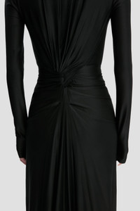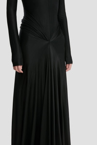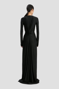 Crafted from a high-shine stretch jersey, the Cut-Out Gown in Black marries sophistication and provocation. Defined by a round neckline, extra-long sleeves and floor-pooling hemline, its modest silhouette is punctuated by a tactile twisted detail with cut-outs at the back bodice. Size & Fit - The model is 5'10’’/178cm and is wearing a size 6 - Fits true to size, take your normal size Product Details - High shine, stretch jersey fabrication - Floor-length - Back twist detailing with cut outs - Round neckline - Long sleeves, styled ruched at the cuff - Pleat waist detail - Front skirt split - 90% Viscose 10% Elastane - Made in Portugal