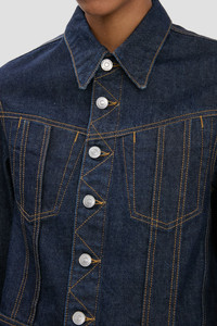 - Indigo, cropped denim jacket - Long sleeves and cropped body - Non-stretch mid-weight denim - Seam detailing with tobacco topstitching - 100% Cotton - Machine wash at 30C - Made in Italy The Denim Jacket in Light Rinse plays with silhouette proportions, contrasting extra-long sleeves with a cropped hemline. Designed with a neat fit, it has a traditional collar and front placket fastening, branded denim shank buttons and tobacco topstitching. Crafted from a non-stretch, mid-weight denim, it blends masculine and feminine references for a fresh take on a wardrobe classic. SIZE & FIT - Fitted silhouette - Fits true to size, take your regular size - The model height is 5'11’’/180cm and is wearing a size 6