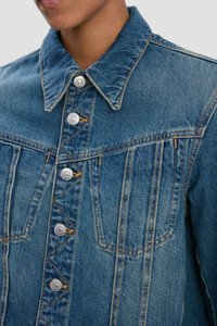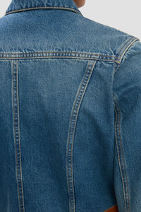 - Mid blue wash, cropped denim jacket - Long sleeves and cropped body - Collar and front placket fastening - Non-stretch mid-weight denim - Branded denim shank buttons - Seam detailing with tobacco topstitching - 100% Cotton - Machine wash at 30C - Made in Italy The Denim Jacket in Mid Blue Wash plays with silhouette proportions, contrasting extra-long sleeves with a cropped hemline. Designed with a neat fit, it has a traditional collar and front placket fastening, branded denim shank buttons and tobacco topstitching. Crafted from a non-stretch, mid-weight denim, it blends masculine and feminine references for a fresh take on a wardrobe classic. SIZE & FIT - Fitted silhouette - Fits true to size, take your regular size - The model height is 5'11’’/180cm and is wearing a size 6
