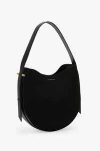 Crafted from canvas for a utilitarian point of difference, the Dia Hobo Bag in Black has a softly structured rounded silhouette, gold cufflink hardware and leather accents, including a shiny leather handle. Meticulously made in Italy, it has a magnetic closure and small internal slip pocket for secure storage. Elevated details include a Victoria Beckham logo and unique serial number discreetly placed inside the bag. Inspired by the creative energy of New York City, it marries masculine and feminine viewpoints beautifully. Size & Fit - Height: 57.5cm, Width: 34cm, Depth: 9cm, Drop With Strap: 22cm Product Details - Cufflink inspired hardware - Canvas body with shiny calf strap - Shoulder strap not adjustable - Synthetic nappa leather lining - Small internal flat pocket - Features our signature gold branding with VB logo and a unique code - On calf leathers, regularly apply a small amount of nourishing cream and buff gently using a cloth - 100% Calf Leather - Made in Italy
