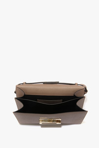 A hero item in the house’s leather goods edit, the Dorian Bag marries masculine textures and feminine details. Presented in a grained leather and delicate shade of Dove Grey, it has a removable and adjustable ‘smart strap’ and snap buttons for versatile styling as a shoulder or crossbody bag. The signature B buckle has been reworked to create a dynamic new locking system, while internally a double compartment and small flat leather pocket allow for secure storage. Finished with the discretely stamped address of Victoria’s London studio (N.202) and a unique serial number, it is a sophisticated proposition for the new season. Size & Fit - Height: 16.5cm, Width: 25cm, Depth: 8.5cm. Product Details - Smart strap allows for multiple wearing options - Internal double compartment - Features our signature gold branding with VB logo and a unique code - Microsuede lining - Textured small grainy calf leather - 100% Calf leather - On calf leathers, regularly apply a small amount of nourishing cream and buff gently using a cloth - Made in Italy