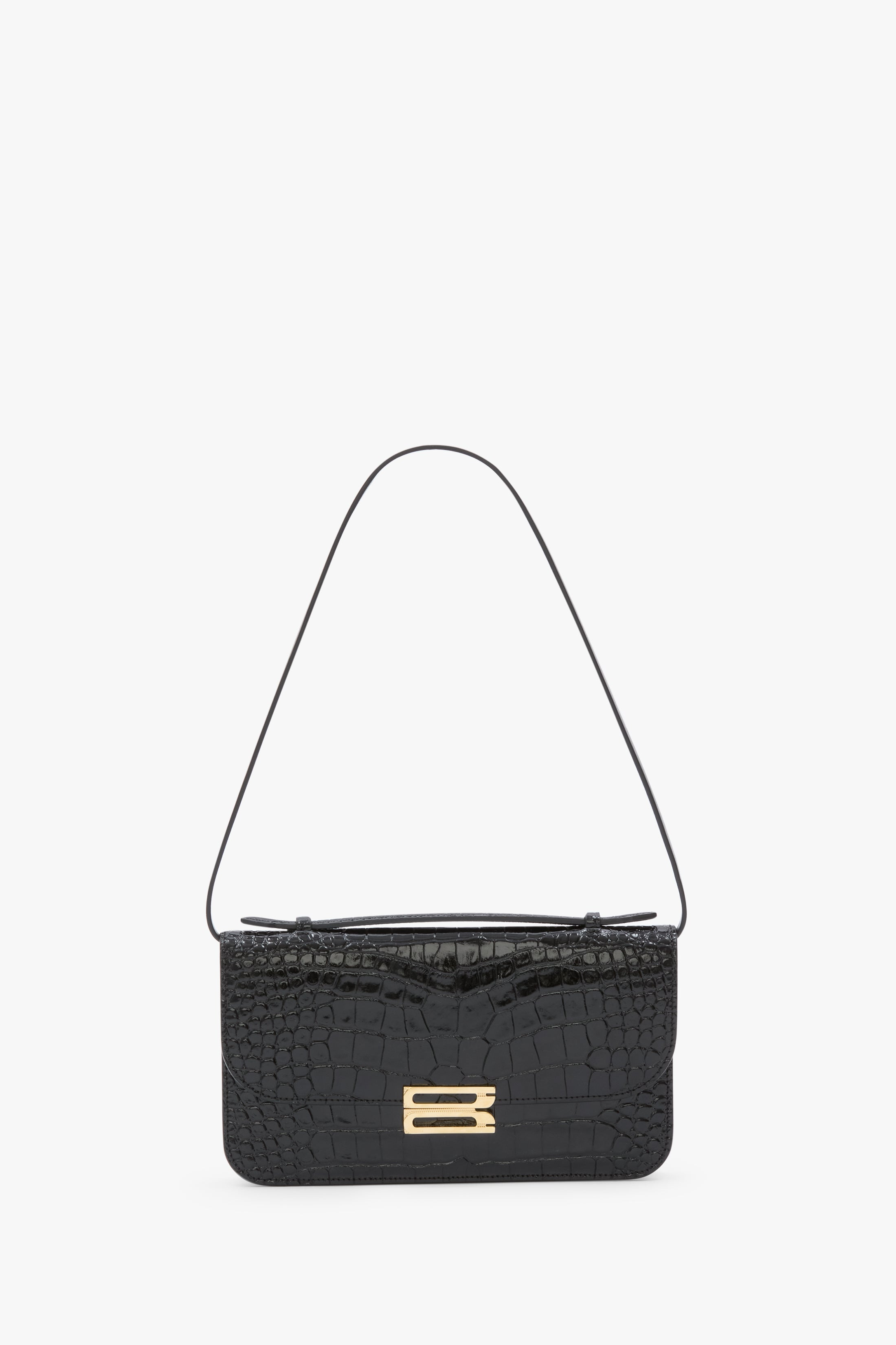 New to the Victoria Beckham leather goods edit, the Dorian Pochette is a polished evening wear handbag with a structured top handle and a removable strap. Made in Italy from croc-embossed calf leather and microsuede lining, it has the house’s signature B Frame, split-lock hardware and an internal double compartment with flat pocket. Presented in classic Black, it has an understated elegance. Size & Fit - Height 14.5cm, Width 25cm, Depth 1.5cm Product Details - Top handle functionality, with additional removable shoulder strap - Signature B frame split-lock hardware - Croc embossed calf, 100% leather - Microsuede lining - Internal double compartment, with flat pocket - 100% Leather - Wipe clean with a soft, dry cloth - Made in Italy