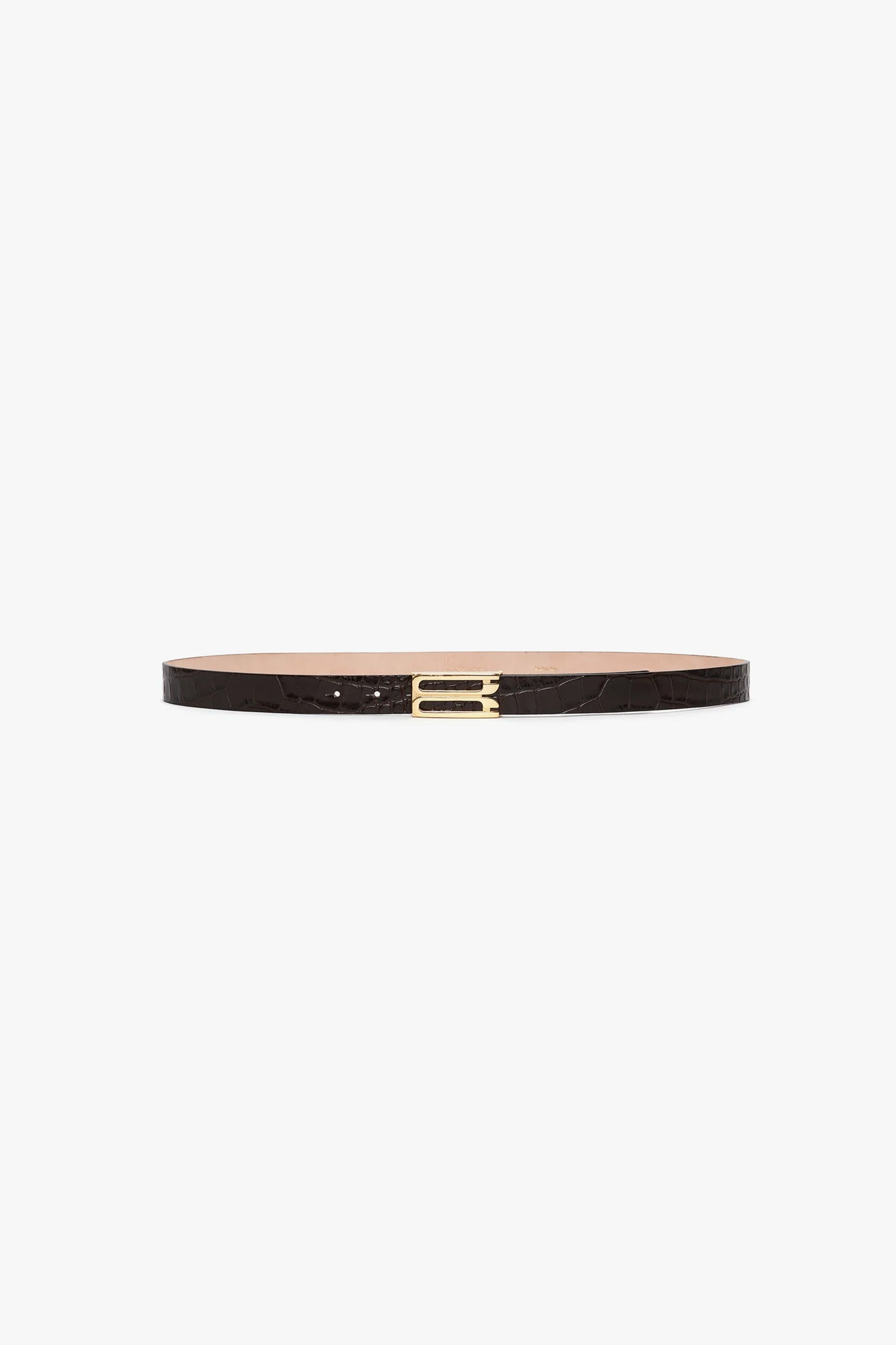 Exquisitely made from tactile croc-embossed calf leather in a creamy shade of Espresso, the Frame Belt will add a discrete finishing touch to tailored separates and feminine dresses. Embellished with refined gold hardware, it reflects the house’s signature polish. Product Details - Croc embossed calf leather - Luxury gold plated hardware - Small: 70cm, Width: 23mm - Medium: 80cm, Width: 23mm - Large: 90cm, Width: 23mm - Xlarge:100cm, Width 23mm - Fits true to size, take your regular size - 100% Calf Leather - Wipe clean with a soft, dry cloth - Made In Italy