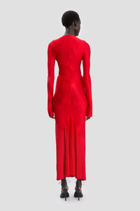 A potent Cardinal Red colourway brings fresh energy to the modest Long Sleeve Gathered Midi Dress. Crafted from stretch jersey with a high shine, it is fitted through the body and sleeve with a circular gathered detail at the front of the skirt adding a flattering focal point. Long sleeves with a split cuff detail complete the look. Size & Fit - The model is 5'10’’/178cm and is wearing a size 6 - Fits true to size, take your normal size Product Details - High shine, stretch jersey fabrication - Circle gathered detail - Round neckline - Long sleeves with split cuff - Back hip gathering - Concealed zip with hook & eye closure - 90% Viscose 10% Elastane - Made in Portugal