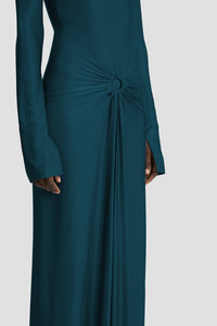 The body-sculpting stretch jersey of the Long Sleeve Gathered Midi Dress creates a figure-flattering silhouette. A circular gathered detail at the front waist adds a flattering focal point, while long sleeves with split cuffs add a discreet design detail. A new-season Dark Teal colourway offers further refinement and versatility. Size & Fit - The model is 5'11’’/180cm and is wearing a size 6 - Fits true to size, take your normal size Product Details - High shine, stretch jersey fabrication - Circle gathered detail - Round neckline - Long sleeves with split cuff - Back hip gathering - Concealed zip with hook & eye closure - 90% Viscose 10% Elastane - Made in Portugal