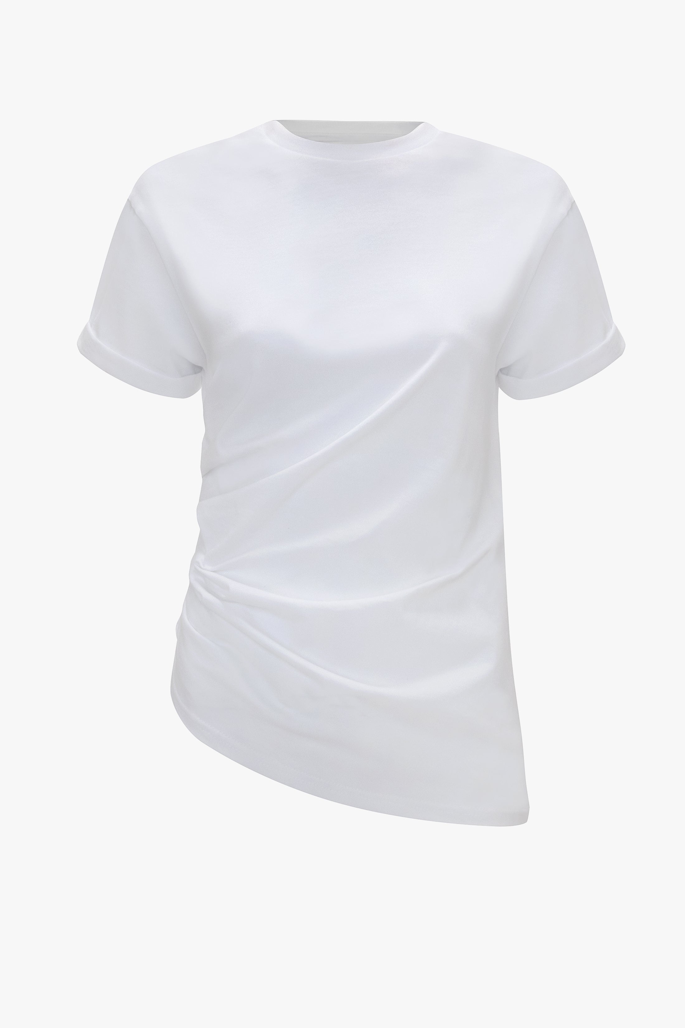 Tactile side ruching brings finesse to a simple white T-shirt in the Gathered Detail T-Shirt. Elevated further with an asymmetric hemline and a Victoria Beckham logo at the back of the neck, it also has turned-back short-sleeve cuffs for a hint of off-duty ease. Crafted from 100% organic cotton, it is a year-round wardrobe essential. Size & Fit - Fits true to size, take your regular size - The model height is 180cm / 5'11 and is wearing a size XS Product Details - Gathered side detail - VB branding at centre back neck - Turned back short sleeve cuffs - Asymmetric hem - 100% Organic Cotton - Machine wash at 30C - Made in Portugal