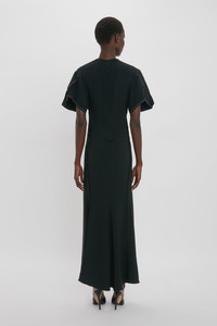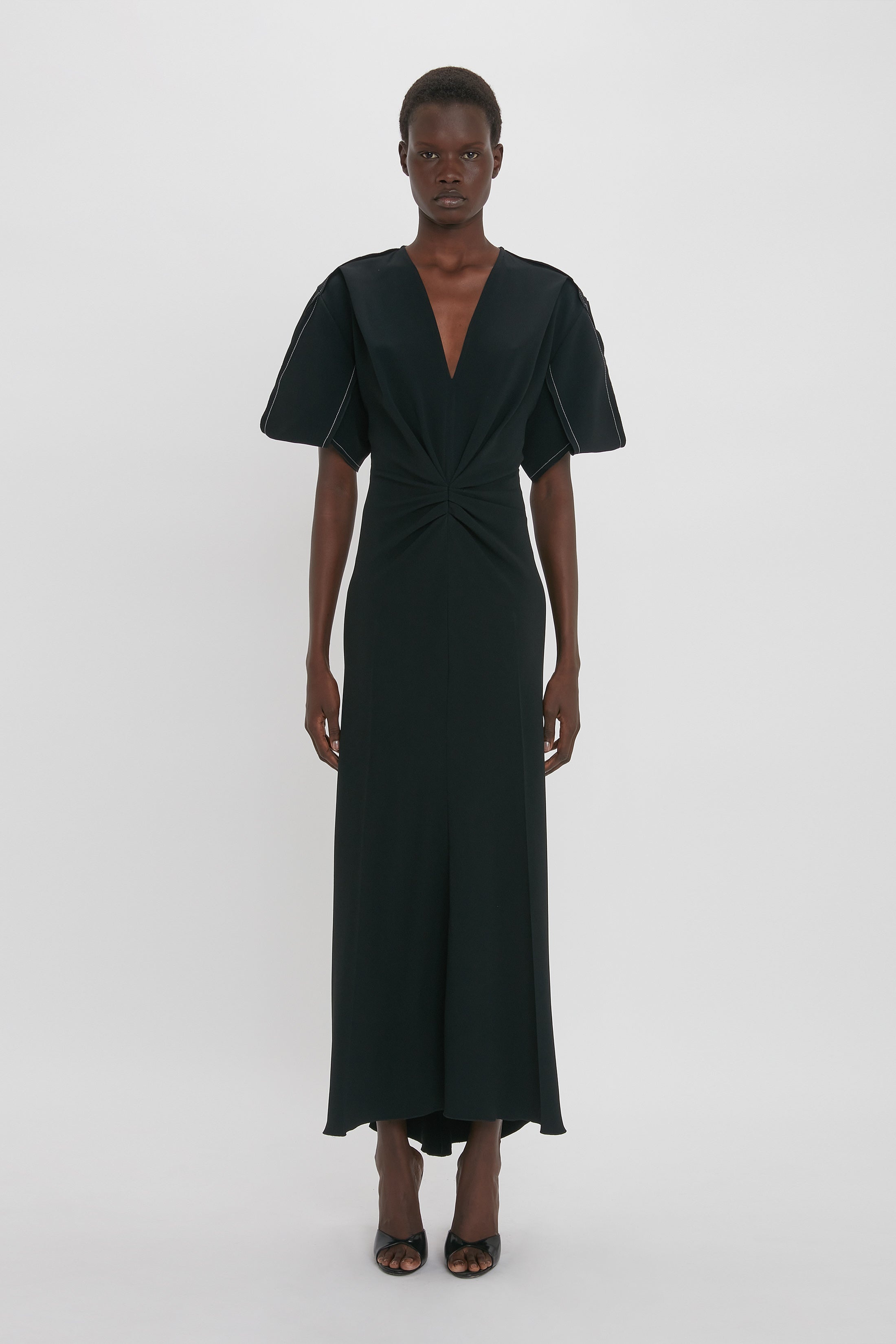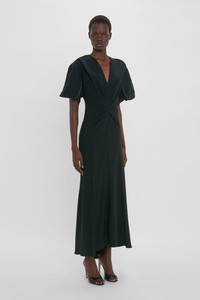 The Gathered V-Neck Midi Dress is crafted from a figure-flattering stretch fabric. A soft curved neckline, waist-defining pleat detail and longer-length hem at the back create a pared-back but polished silhouette, while exposed seams and contrasting topstitching imbue this piece with a contemporary edge. Styled with the High Heel Size & Fit - Fits true to size, take your regular size - The model height is 176cm and is wearing a size 6 Product Details - Crepe back satin fabrication - Curved v-neckline - Waist-defining pleat detail - Draped sleeve - Asymmetric hem (measured from waist): 88cm, graduating to 92cm - 71% Acetate 29% Viscose - Dry clean only - Made in Portugal