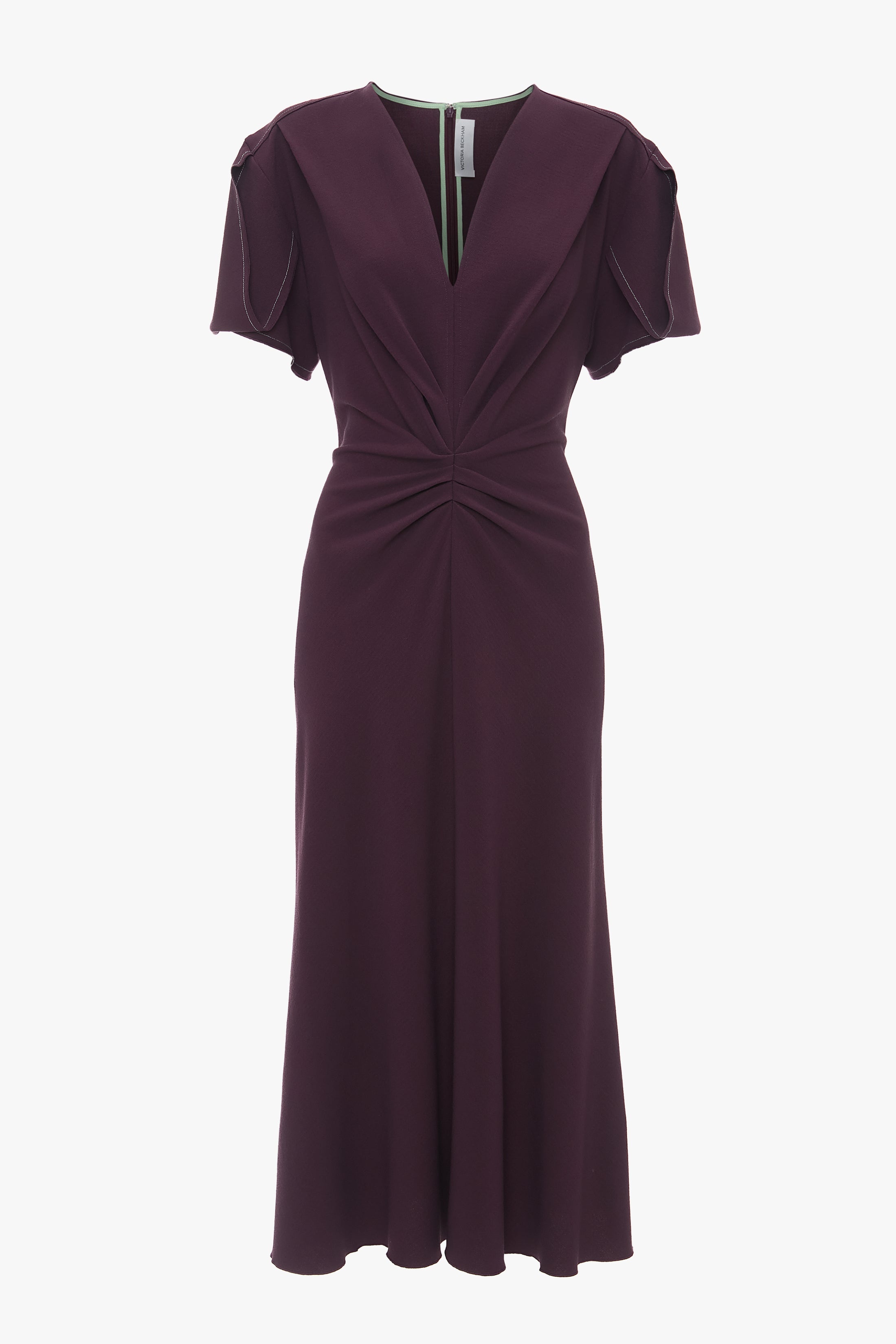 Reimagined in luxurious Fig, the house’s signature Gathered V-Neck Midi Dress embodies effortless elegance. Shaped at the waist but with a relaxed fit through the bodice and gently flared skirt, it has a refined but informal appeal. Pleat details at the front waist and front shoulder bring tactility and definition to the silhouette, while exposed seams, contrast topstitching and an asymmetric hemline at the back reflect the brand’s uncompromising attention to detail. Styled with the Open Toe Cage Sandal Size & Fit - Fits true to size, take your regular size - Fitted around the waist with a more relaxed fit through the bodice - The model height is 5'10''/178cm and is wearing a size 6 Product Details - Front v-neckline - Pleat detail on front waist and front shoulder - Exposed seams and contrast topstitching details - Hard press details through skirt and back shoulder - Concealed zip with hook and eye closure at back - Hem graduates to be slightly longer at the back - 89% Wool 7% Polyamide 4% Elastane - Dry clean only - Made In Portugal