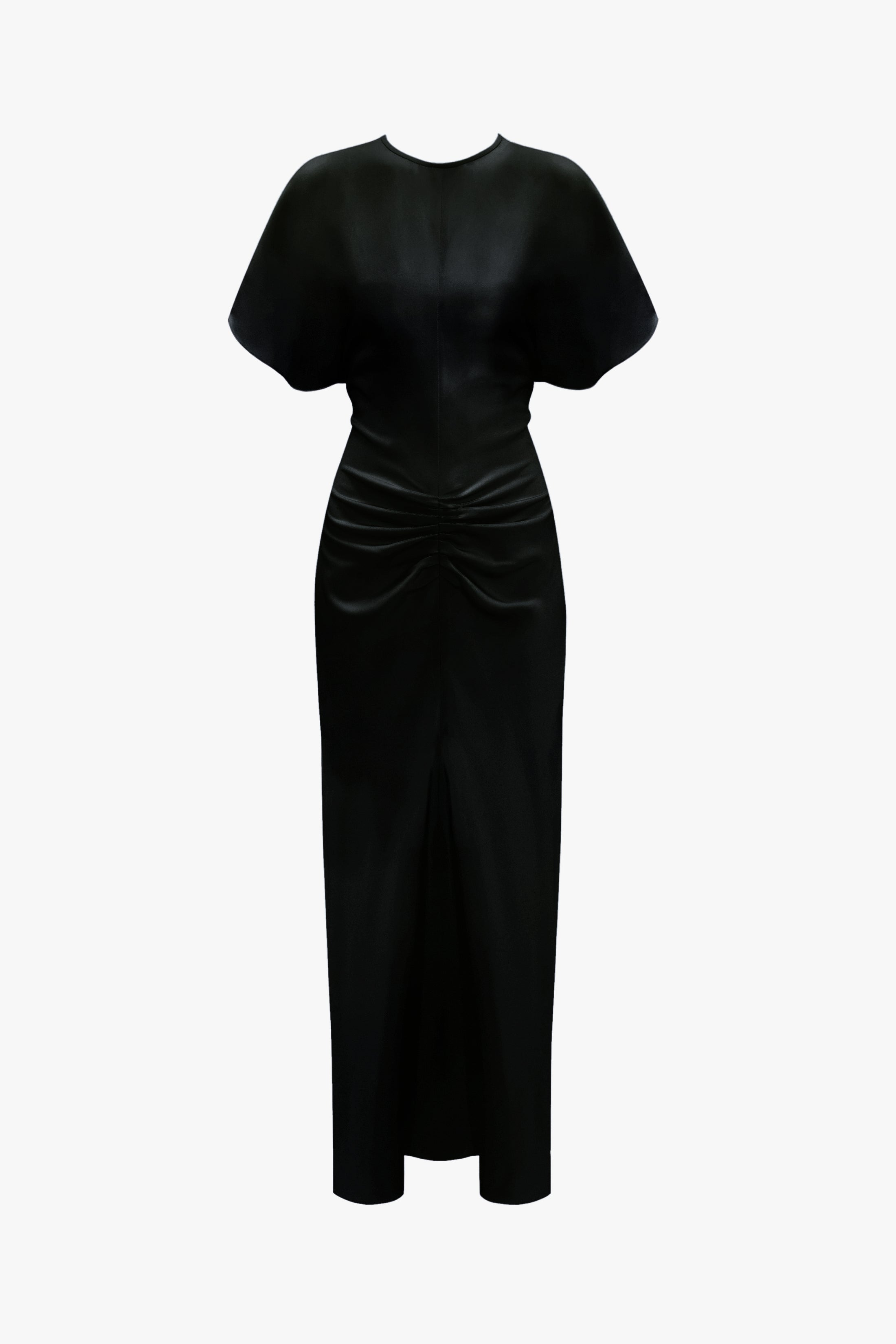 Reimagined in universally appealing Black, this elegant Gathered Waist Midi Dress has a gathered front, tulip sleeve detail and slight V-neck at the back. Immaculately cut to accentuate the waist in a classic fit-and-flare silhouette, the Gathered Waist Midi Dress is rooted in femininity and exudes a modern refinement. Styled with the Classic Mule and Victoria Clutch Bag Size & Fit - Fitted silhouette, take a size up for a more relaxed fit - The model height is 180cm and is wearing a size 6 Product Details - Fluid Cady - Gathered front detailing - Zip at back - 50% Viscose 47% Acetate 3% Elastane - Specialised Dry Clean Only - Made in Portugal